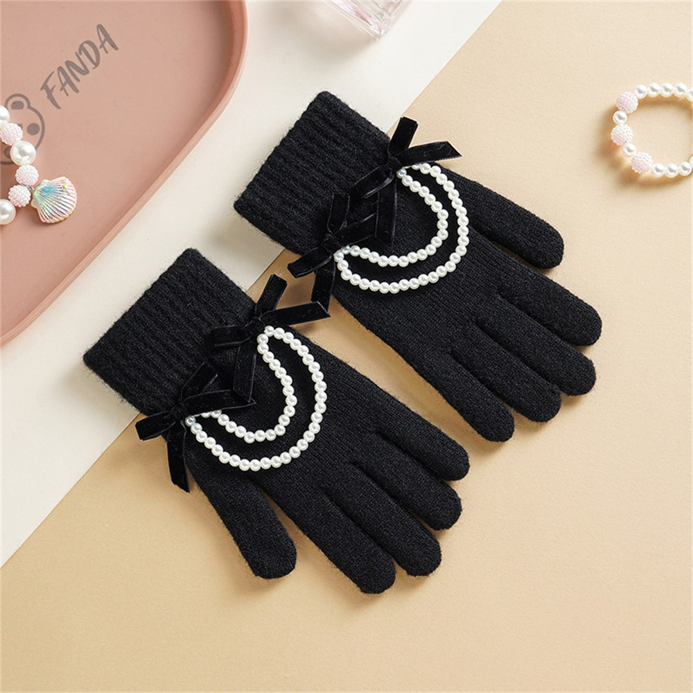 (1 paire) Gants Femme Capacitif Écran Tactile avec Noeuds + Perles (One Size) pour Smartphone / Tablette - Noir