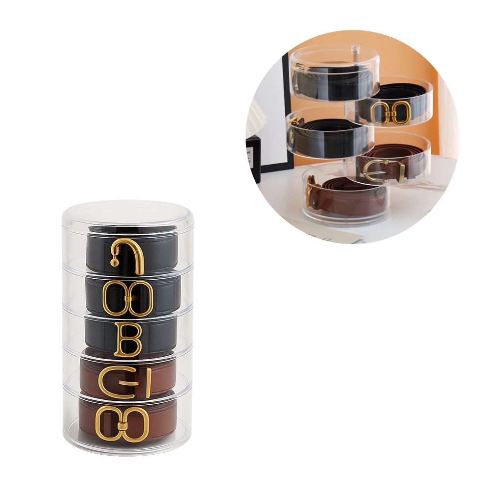 Avec cet organisateur en acrylique, tu conserves tes ceintures avec style et en économisant de la place. La boîte de rangement rotative avec compartiments séparés offre toujours une bonne vue d'ensemble et protège tes accessoires de manière fiable. Le porte-ceintures compact avec couvercle met de l'ordre dans le quotidien et veille à ce que tes objets préférés soient toujours à portée de main.