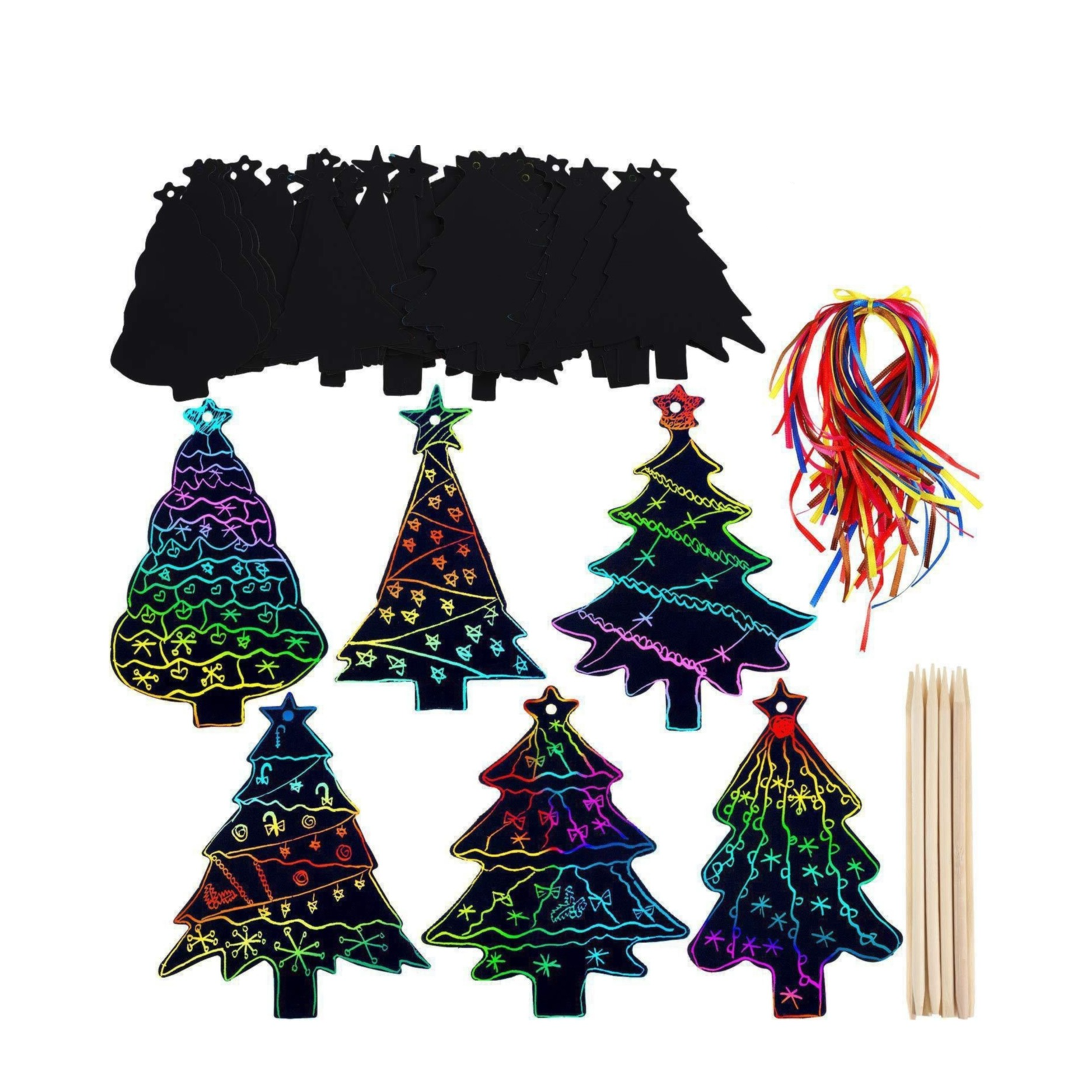(28 pcs. Set) DIY Noël Bricolage Pendentif Arbre de Noël Arc-en-ciel Papier à gratter incl. bâtonnets en bois / ficelles