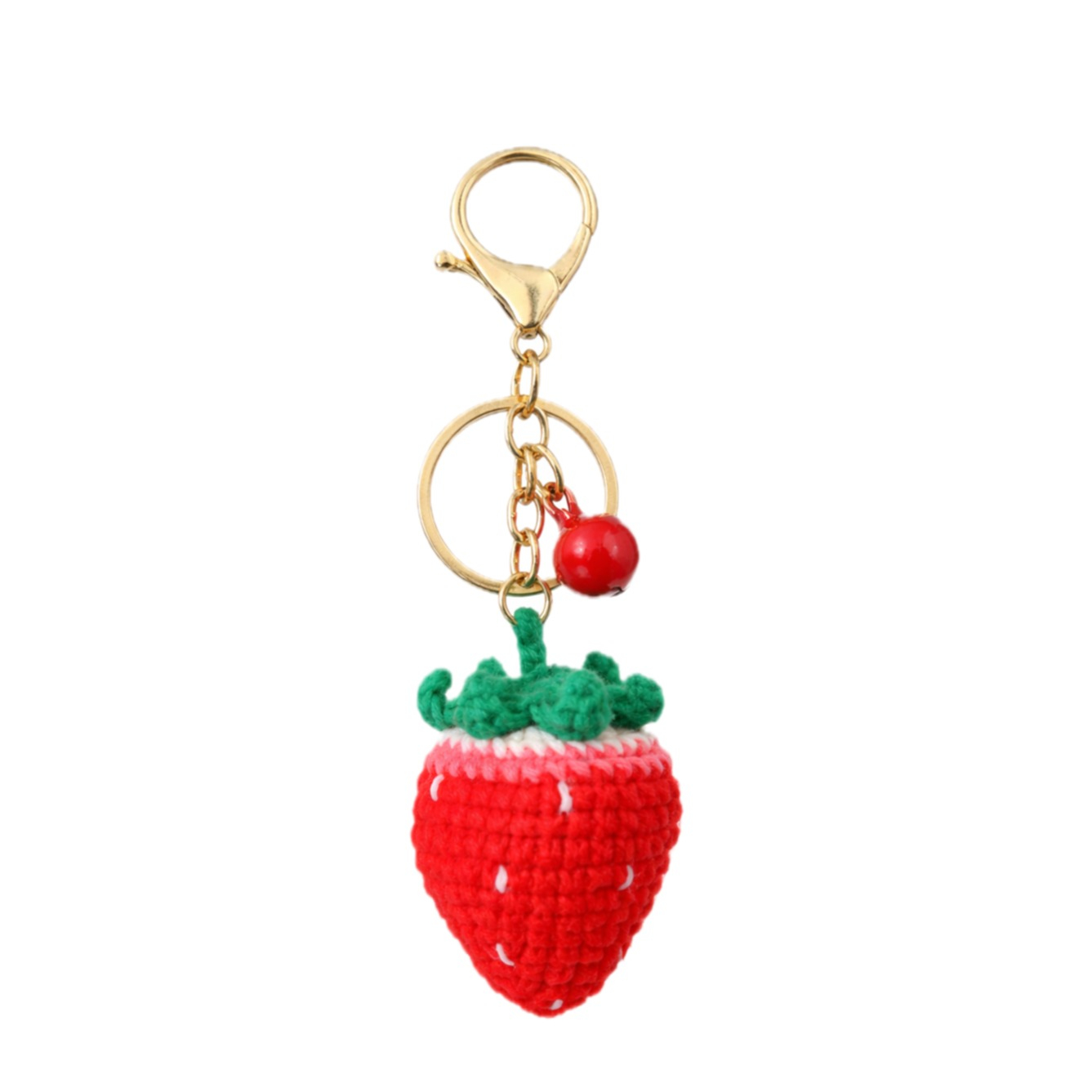 (6x4cm) Porte-clés mini sac à main à la fraise au crochet avec clochette - rouge