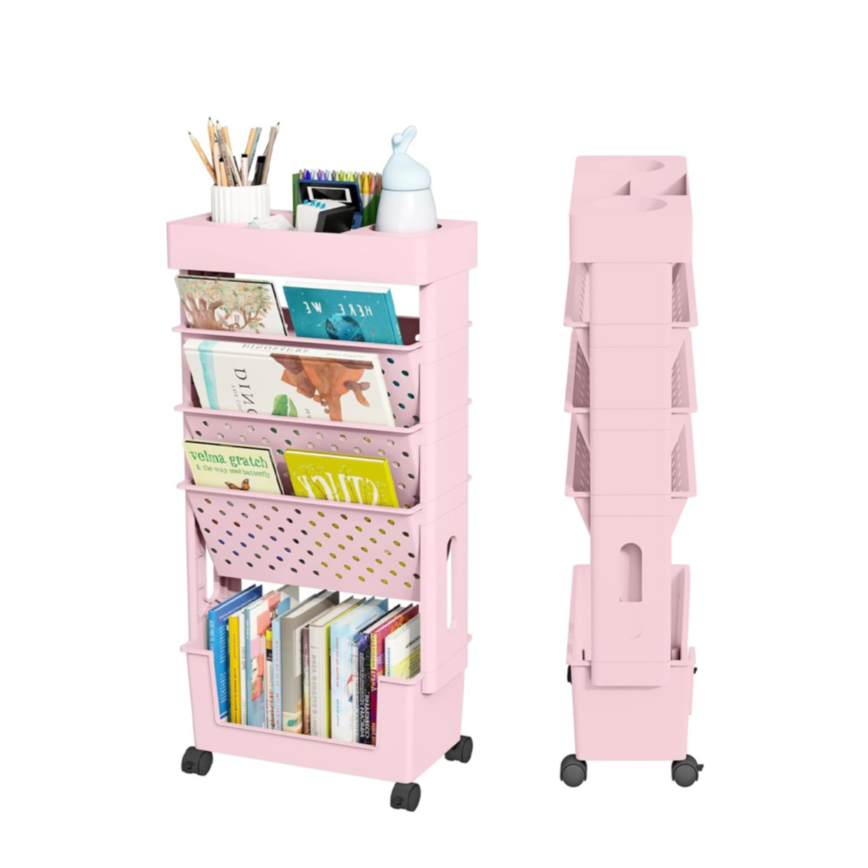 Ce chariot mobile à 5 niveaux est extrêmement pratique pour ta maison et convient parfaitement pour ranger par exemple des produits de nettoyage, du matériel de bureau ou encore des aliments de manière ordonnée. Grâce à ses roulettes, l'étagère Home se déplace partout et peut être utilisée aussi bien dans le bureau que dans la cuisine ou la salle de bain. L'organisateur est également parfait pour la chambre d'enfant ou la salle de classe, pour les livres, les crayons, etc. et tu peux par exemple placer ta bouteille de boisson dans le compartiment supérieur