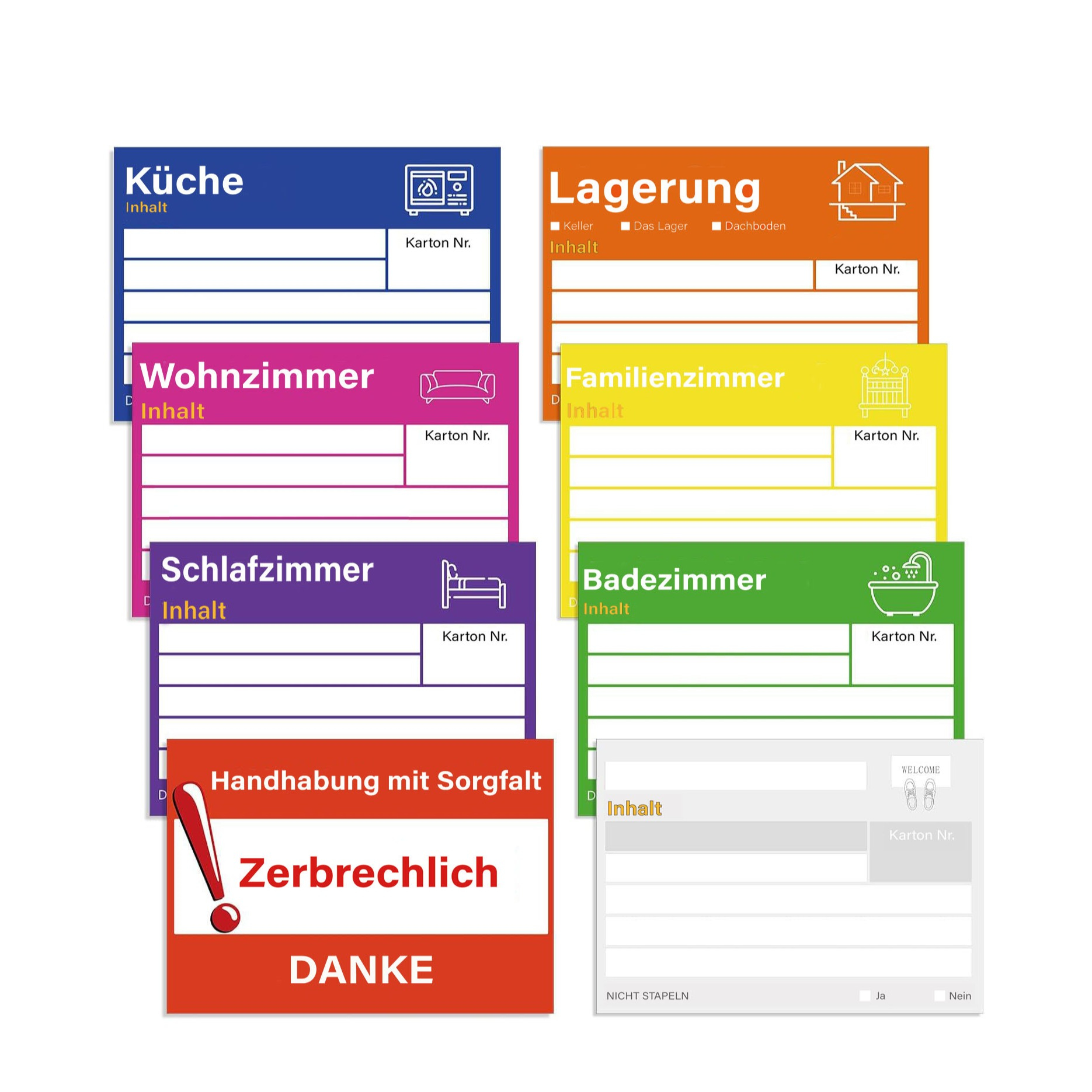 Les étiquettes autocollantes se fixent rapidement et facilement sur n'importe quelle surface et tiennent de manière fiable pendant tout le déménagement. Que ce soit pour la cuisine, le salon ou la chambre à coucher - avec ces autocollants, tu gardes à tout moment une vue d'ensemble. Surtout lors de grands déménagements, la diversité des couleurs assure une organisation structurée et facilite énormément le tri.