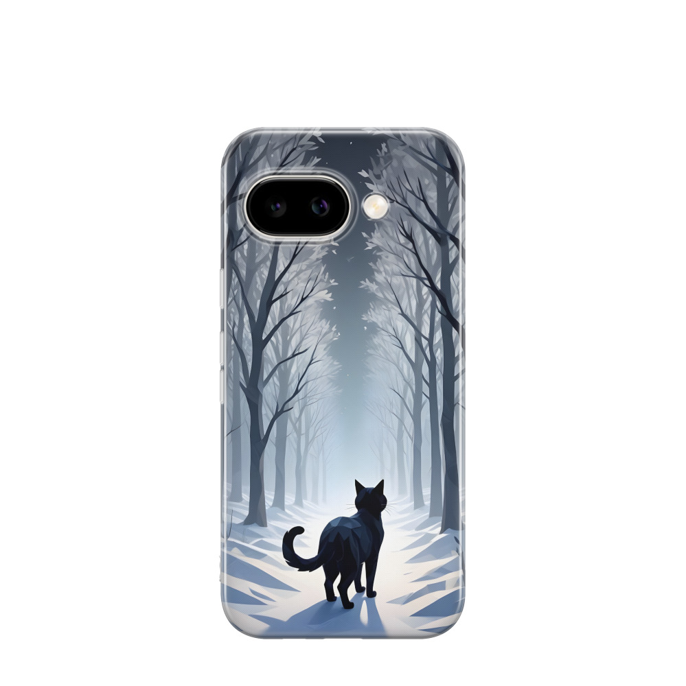 Google Pixel 9a Gummi Hülle Katze im Winterwald - Schwarz