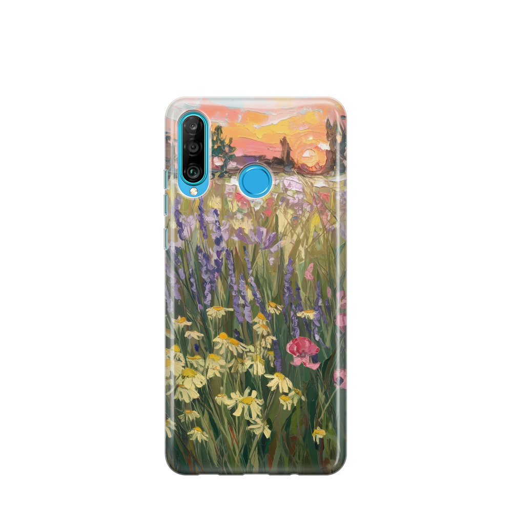 Huawei P30 Lite New Edition Gummi Hülle Abendsonne über der Wiese - Grün
