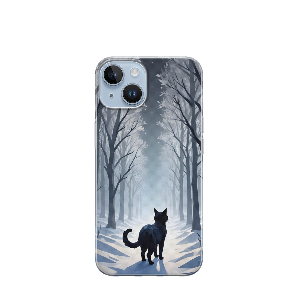 iPhone 14 Gummi Hülle Katze im Winterwald - Schwarz