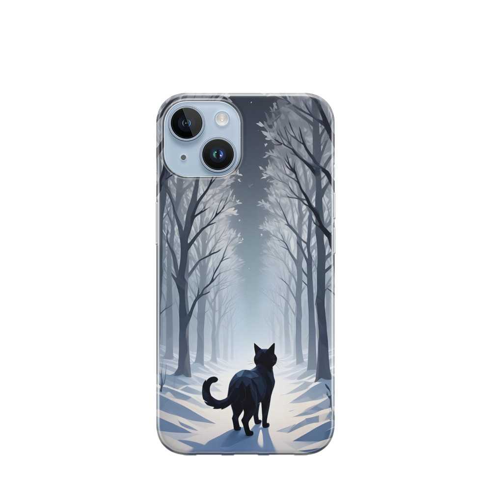 iPhone 14 Plus Gummi Hülle Katze im Winterwald - Schwarz