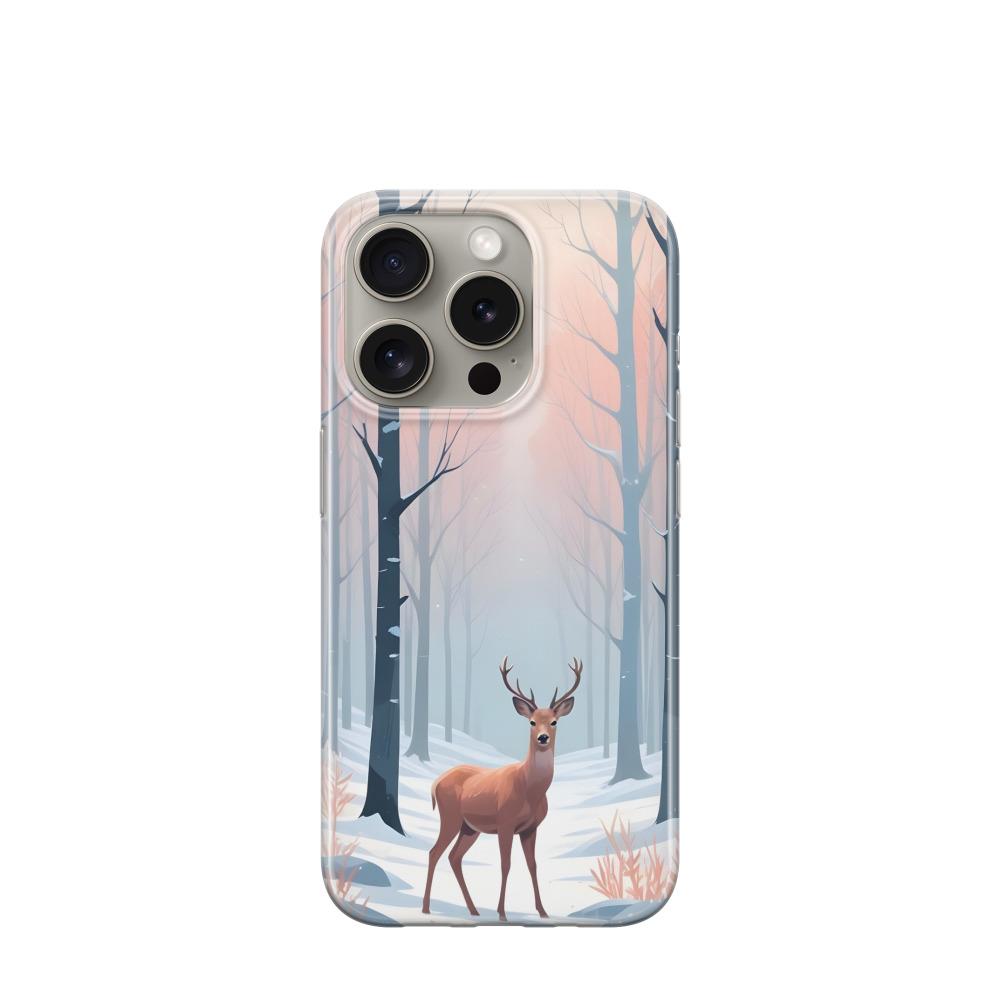 iPhone 15 Pro Gummi Hülle Hirsch im Morgennebel - Weiss