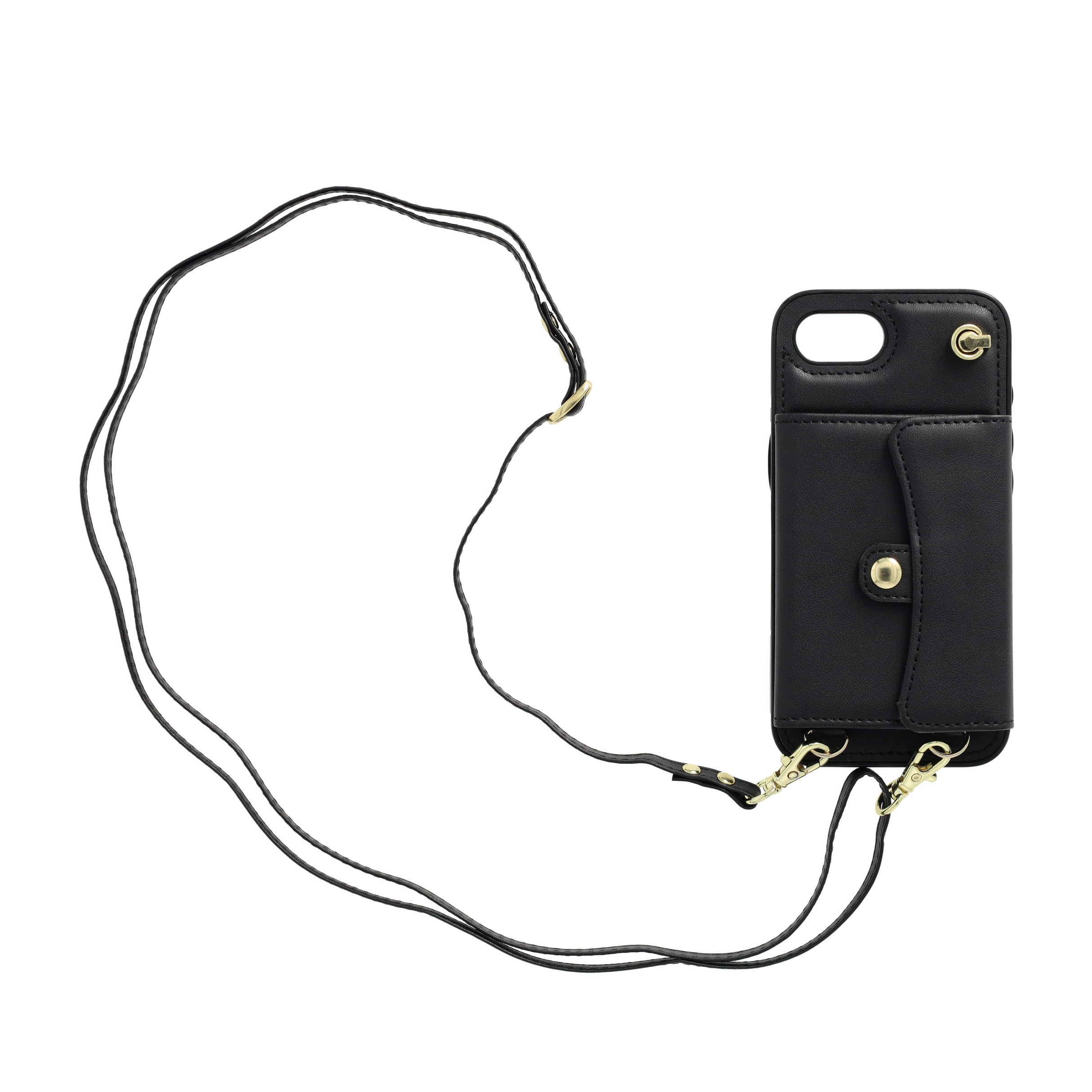 iPhone 16e Cordon de protection en cuir avec porte-carte + Cordon de téléphone (140cm) - Noir