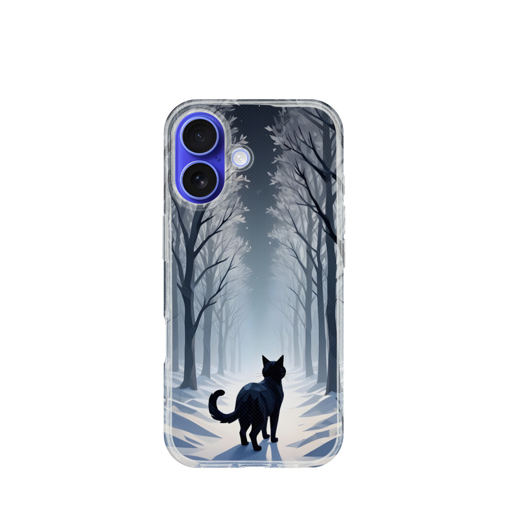 iPhone 17 Gummi Hülle Katze im Winterwald - Schwarz