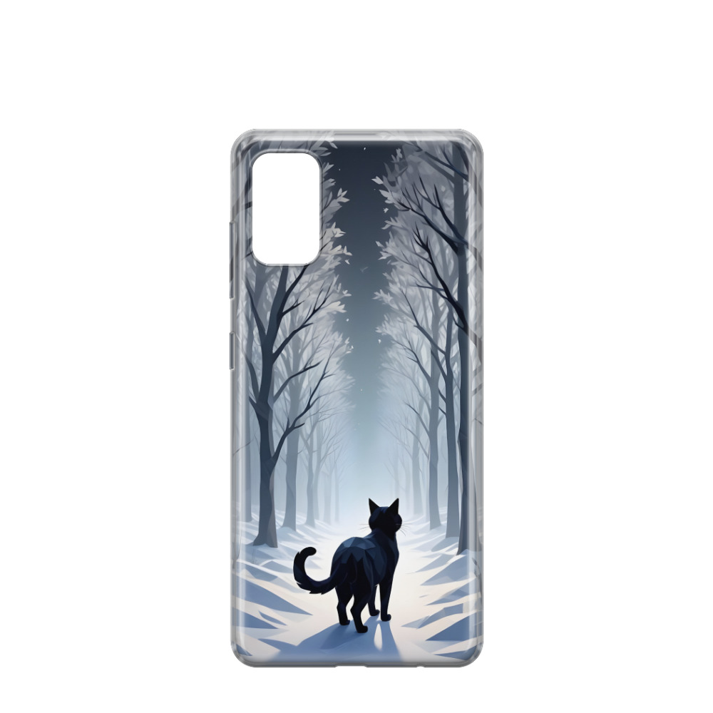 Samsung Galaxy A41 Gummi Hülle Katze im Winterwald - Schwarz