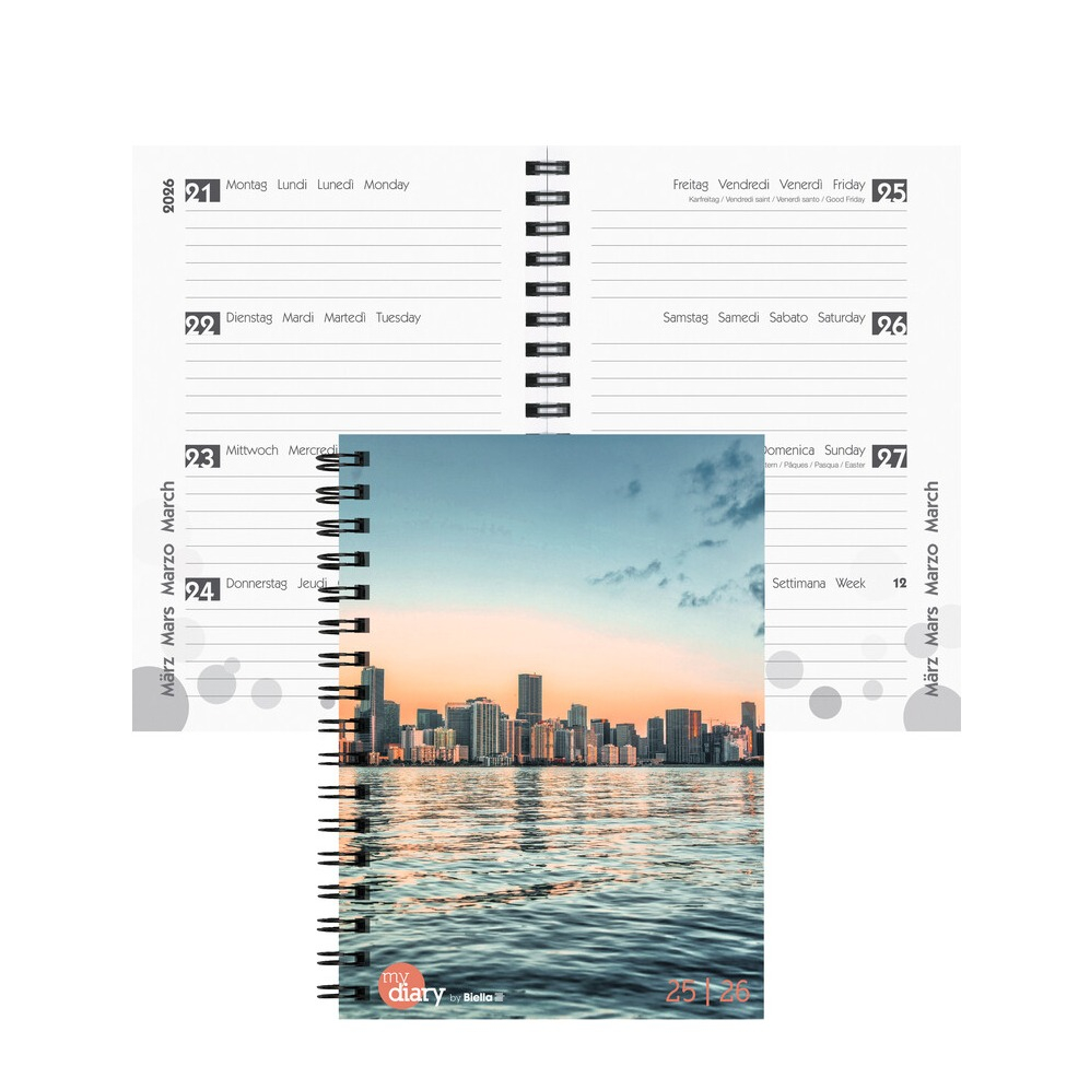 Commande dès aujourd'hui cet agenda scolaire mydiary Wire-O de Biella et sois parfaitement préparé pour l'école ou l'université. Le calendrier hebdomadaire au superbe design Miami est conçu pour l'année 2025-2026 et convient également parfaitement comme cahier de devoirs ou journal intime. La version 1 semaine sur deux pages avec reliure à spirale te permet d'avoir suffisamment de place pour tes rendez-vous scolaires et privés.