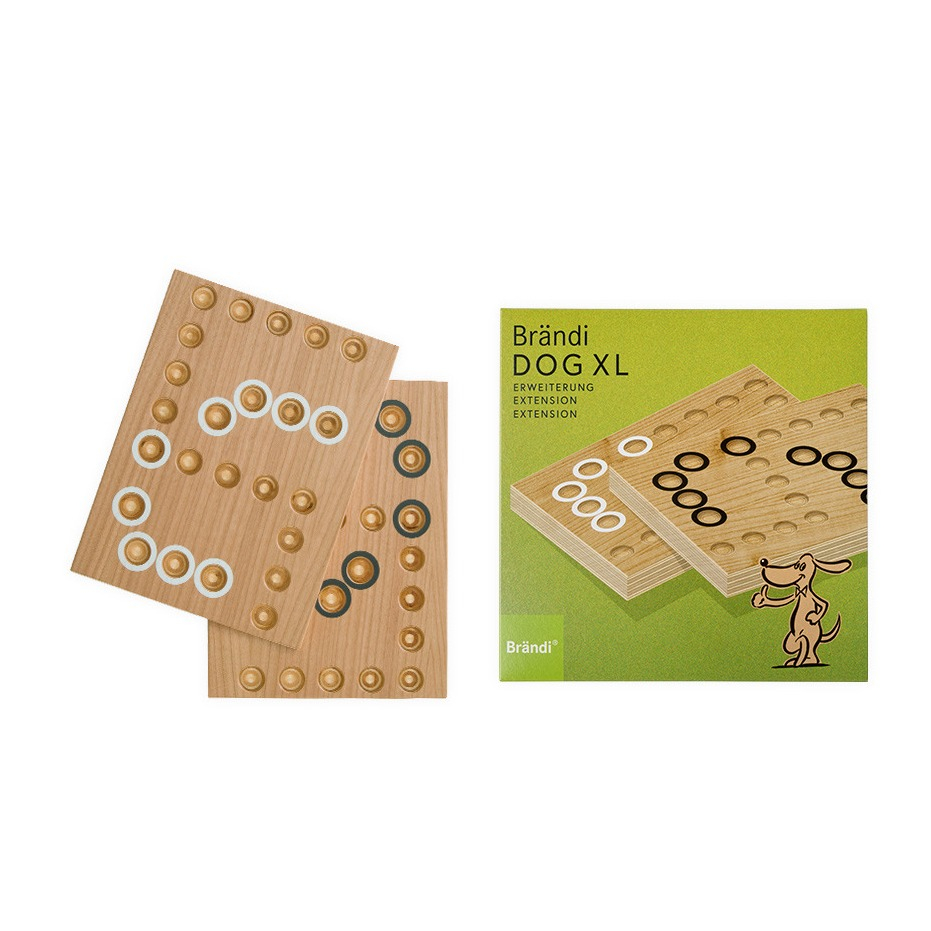 Brändi Dog XL n'est pas seulement un jeu de société passionnant qui se joue en équipe et avec des cartes de bridge, mais il offre une portée de diversité et de motivation à long terme grâce aux éléments tactiques. Le gagnant est l'équipe qui est habile et qui amène les billes en premier à l'arrivée. Tu peux facilement assembler et désassembler les éléments en bois du jeu de société Brändi, par exemple pour les transporter en déplacement. Cette extension te permet de passer de 4 joueurs à 6 joueurs sur le plateau.