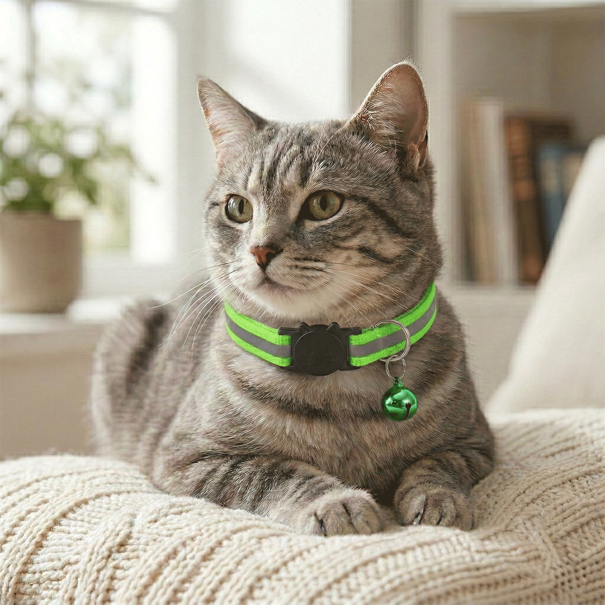 Collier chat réglable avec fines bandes réfléchissantes + clochette - Vert
