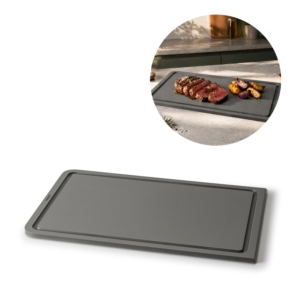 La rainure à jus intégrée permet de recueillir proprement les liquides et de maintenir ton plan de travail en ordre. La planche à découper se révèle particulièrement efficace pour découper la viande ou les ingrédients juteux et facilite considérablement la préparation.