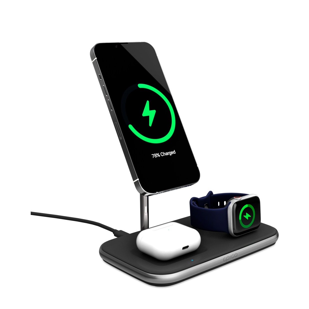 Ce chargeur 3en1 MagSafe de Epico fait bonne figure sur chaque table. Il permet non seulement de connecter ton iPhone (à partir de la série 12), mais aussi de recharger simultanément tes AirPods et ta Apple Watch sur ce support. Si tu n'as pas besoin de recharger tes appareils Apple, le support ne sert pas seulement de chargeur, mais aussi de Support minimaliste pour regarder par exemple des films ou des photos.