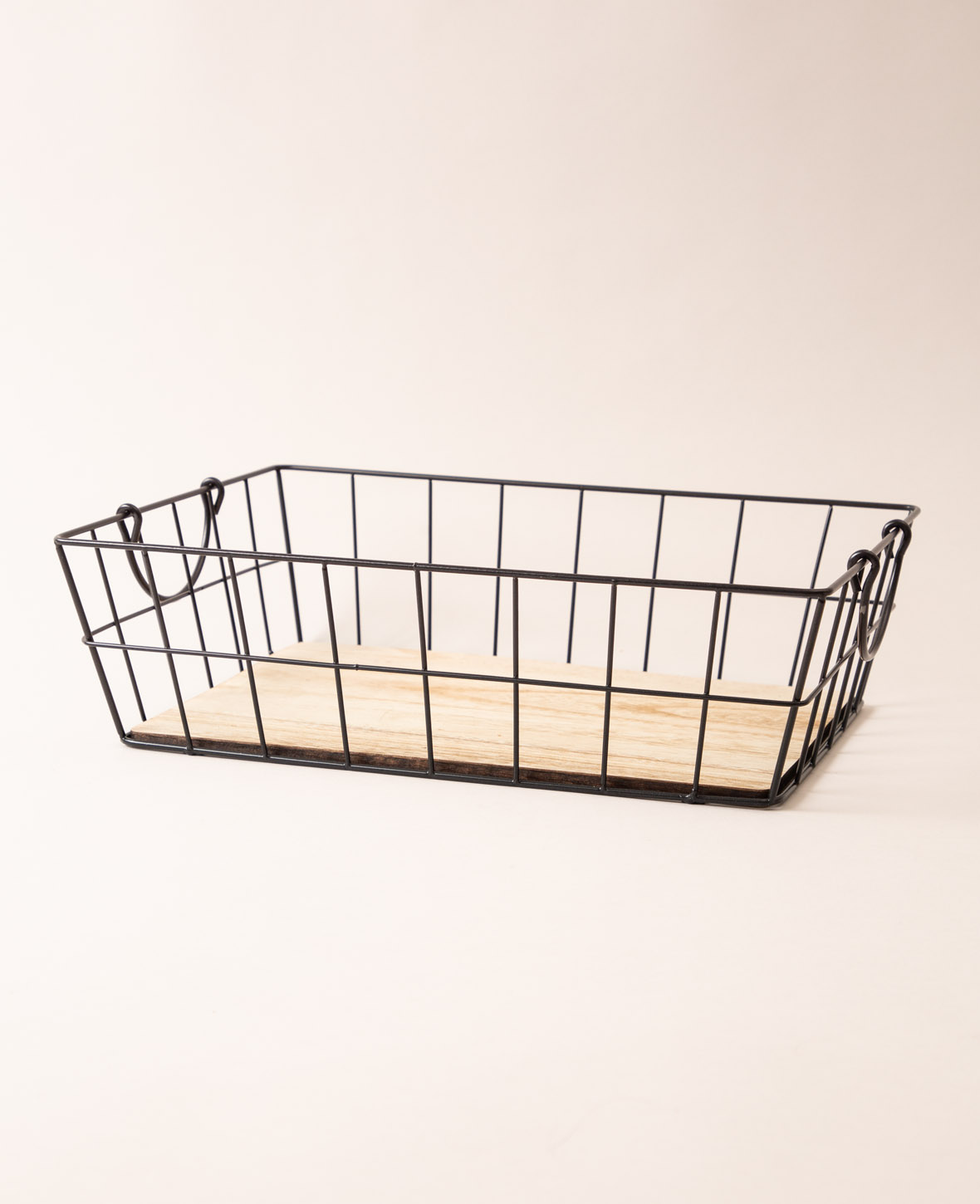 (30x40cm) Panier de rangement en métal Panier métallique empilable avec poignées / fond en bois - Noir