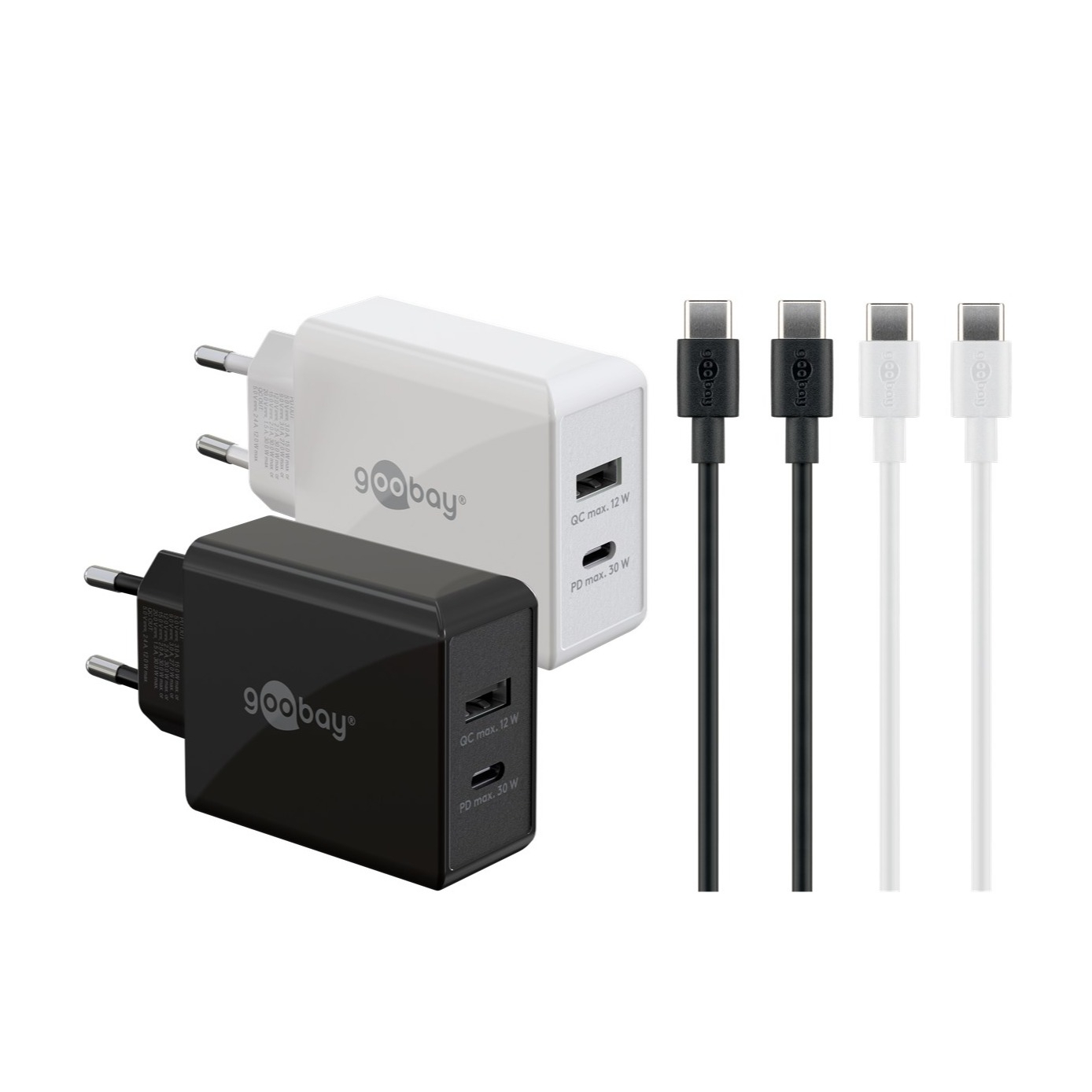 (Lot de 2) Chargeur 30W USB A / USB C Alimentation PD / QC + 1m USB C vers USB C câble de charge (79644) - Noir / Blanc