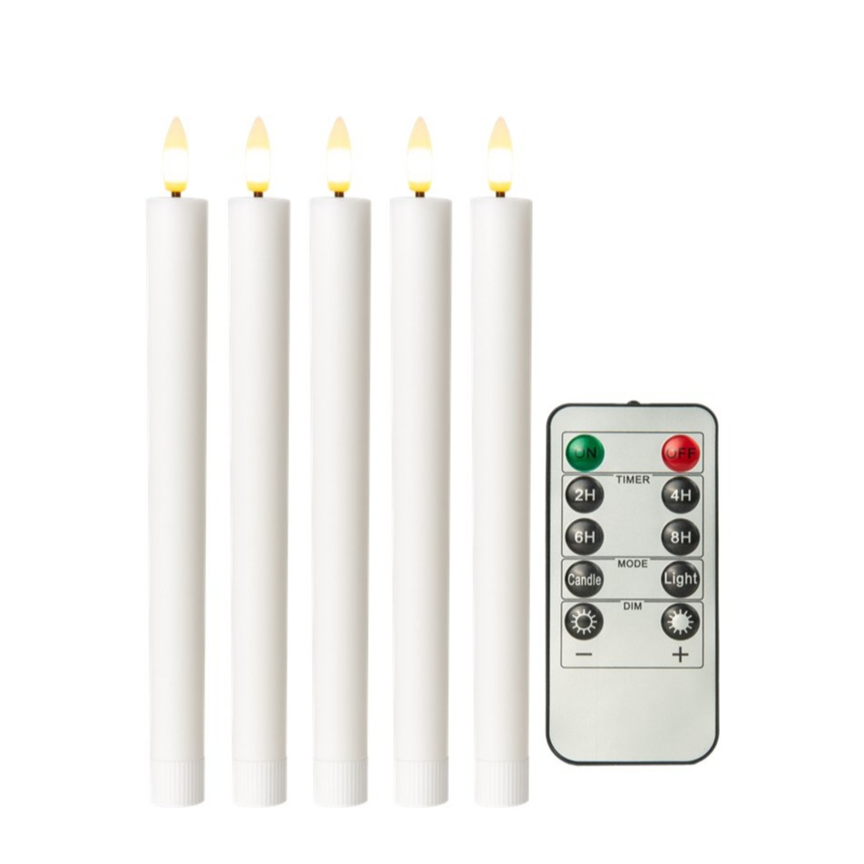 Grâce à la télécommande fournie, les bougies LED s'allument et s'éteignent facilement, leur intensité peut être réduite et la fonction de minuterie intégrée permet de les commander automatiquement (2 / 4 / 6 / 8 heures). Idéales comme décoration intérieure pour le salon, la table à manger, le rebord de fenêtre ou les occasions festives. Les LED bougies sur tige sont conçues pour des bougeoirs d'un diamètre de 2 cm et s'adaptent ainsi à la plupart des bougeoirs disponibles dans le commerce.