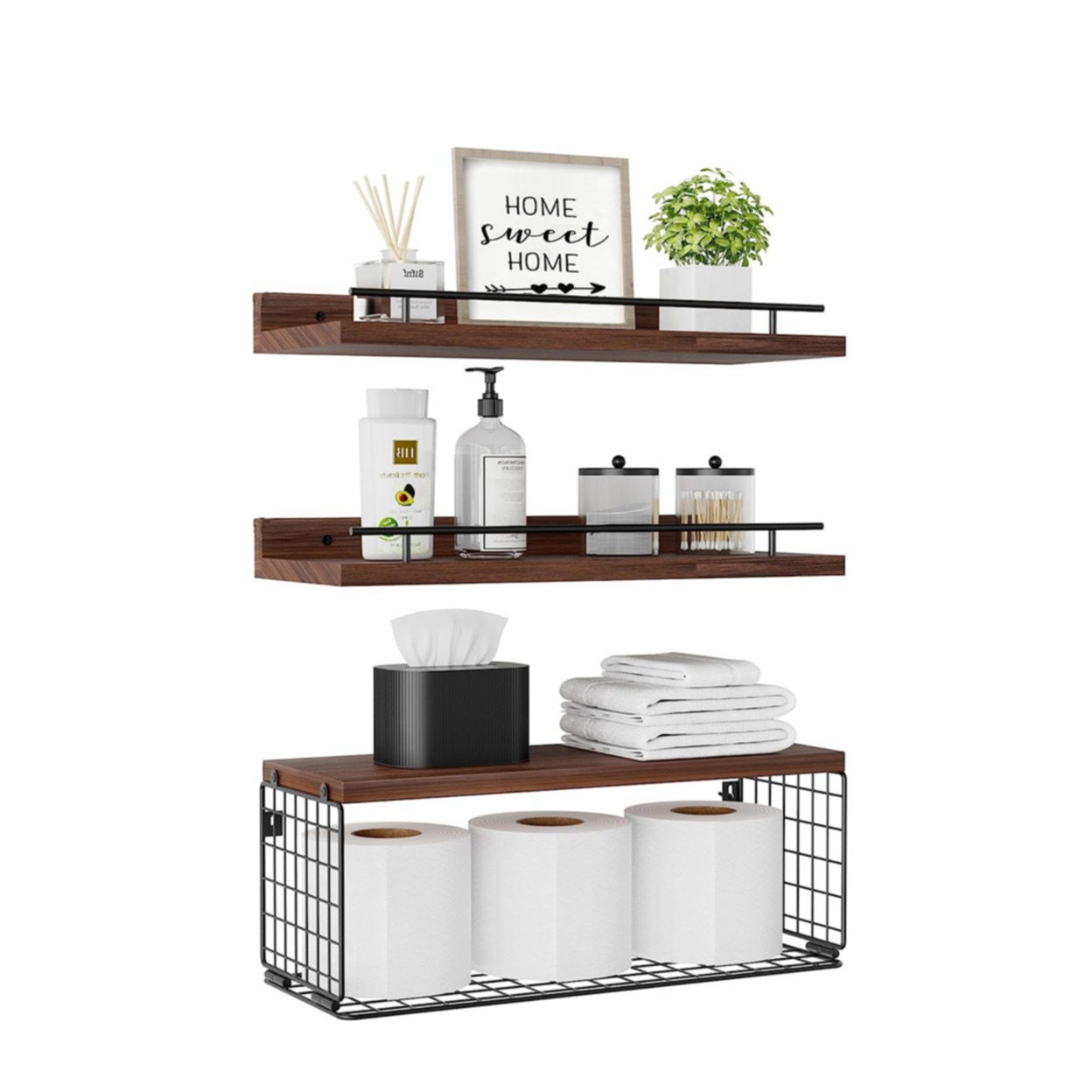 Industriel Bois Étagère murale Loft Décoration maison Étagère flottante à 3 niveaux + compartiment grillagé - Marron foncé / Noir