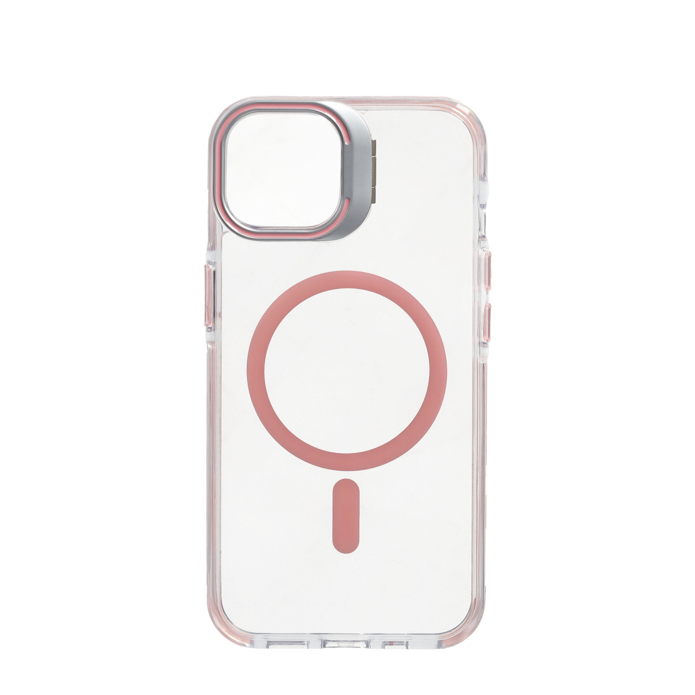 iPhone 15 MagSafe Hybrid Cover TPU Bumper Acrylic Back with Camera Kickstand - Rosa / Transparent