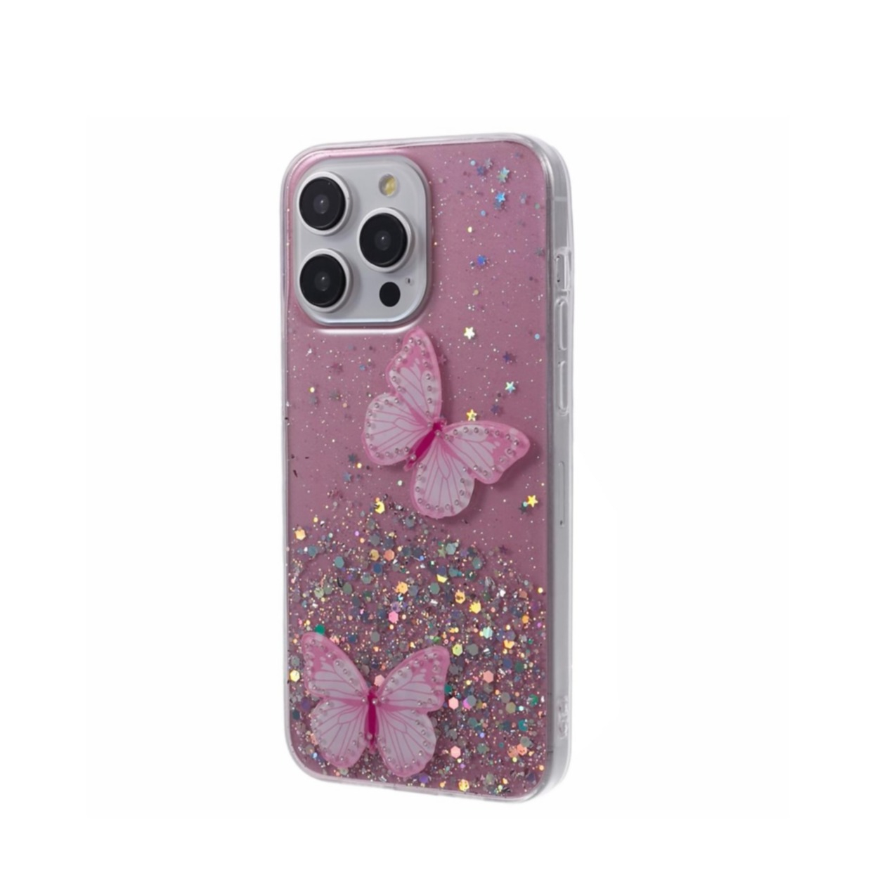 iPhone 16 Pro Coque hybride rigide avec motif de papillon - Rose / Transparent