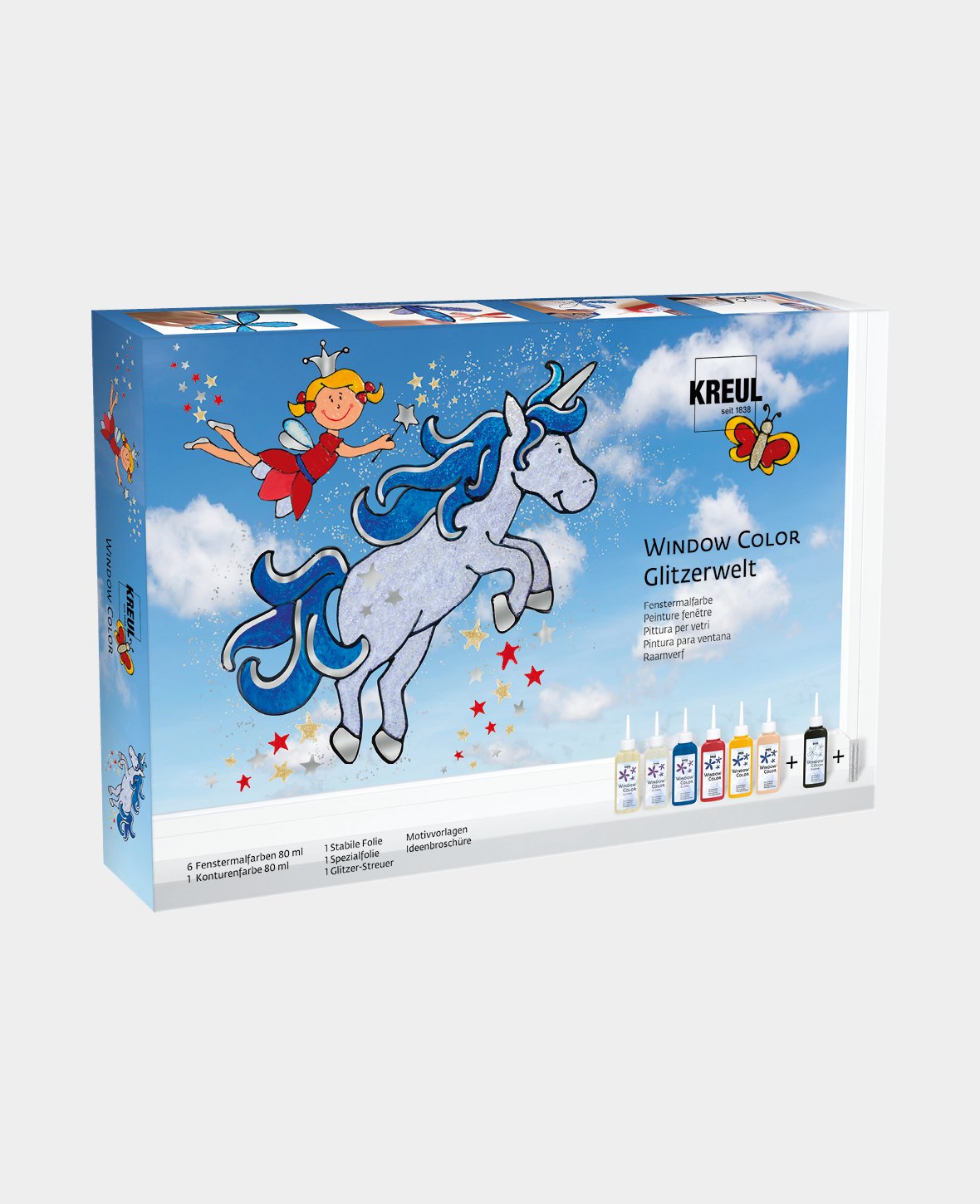 Découvre le monde imaginaire avec le KREUL Window Color set Monde scintillant. Ce set haut en couleur offre tout ce dont tu as besoin pour ton projet DIY autour de la peinture pour fenêtres. Plonge dans des mondes imaginaires enchanteurs avec des sirènes et des licornes chatoyantes. Tu peux appliquer les couleurs à ta guise sur les feuilles stables et donner la touche finale à ton œuvre d'art avec le saupoudreur de paillettes argenté.
