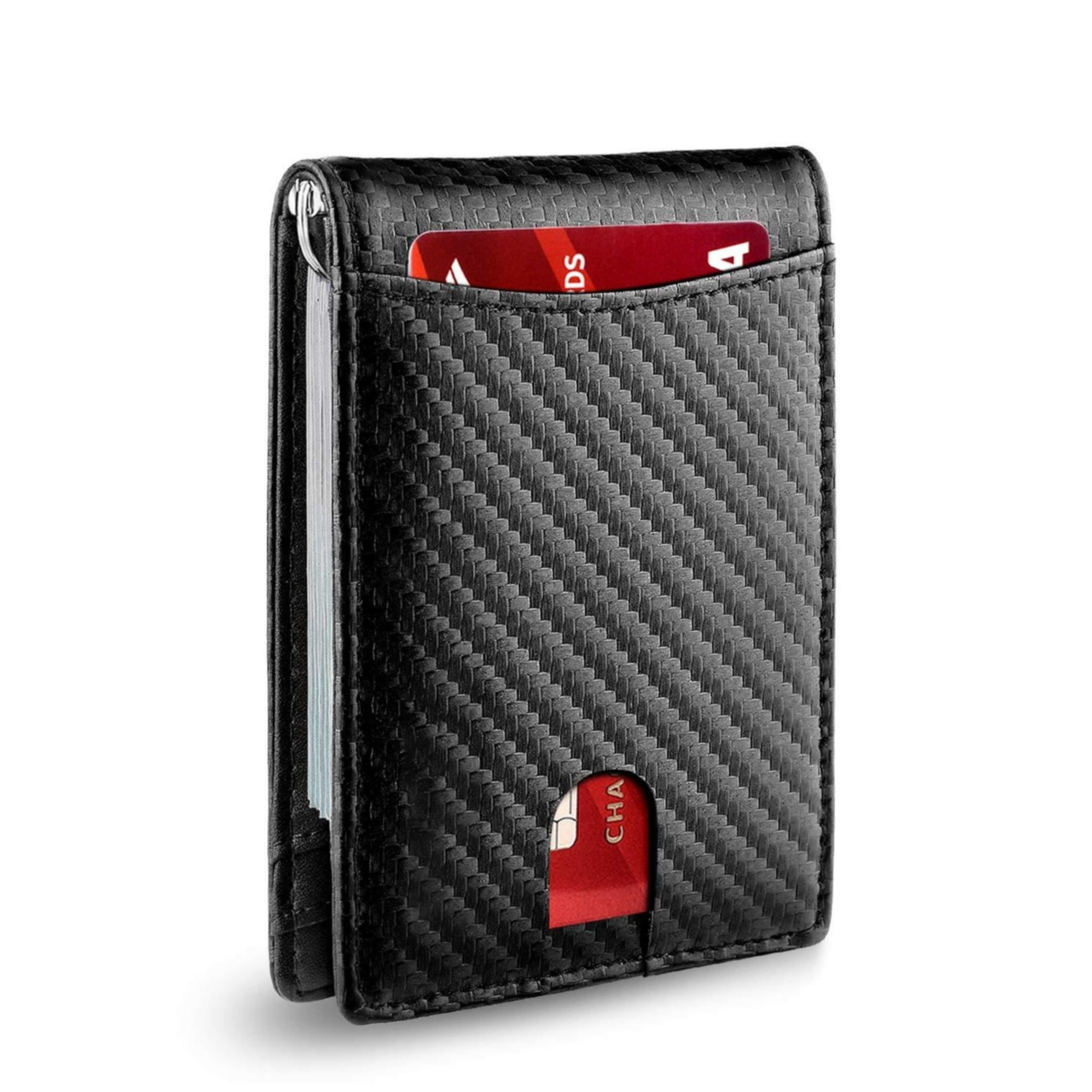 Mini porte-monnaie en cuir véritable pour cartes de crédit avec mécanisme d'extraction de cartes et porte-cartes pour 7 cartes (protection RFID) au look carbone - Noir