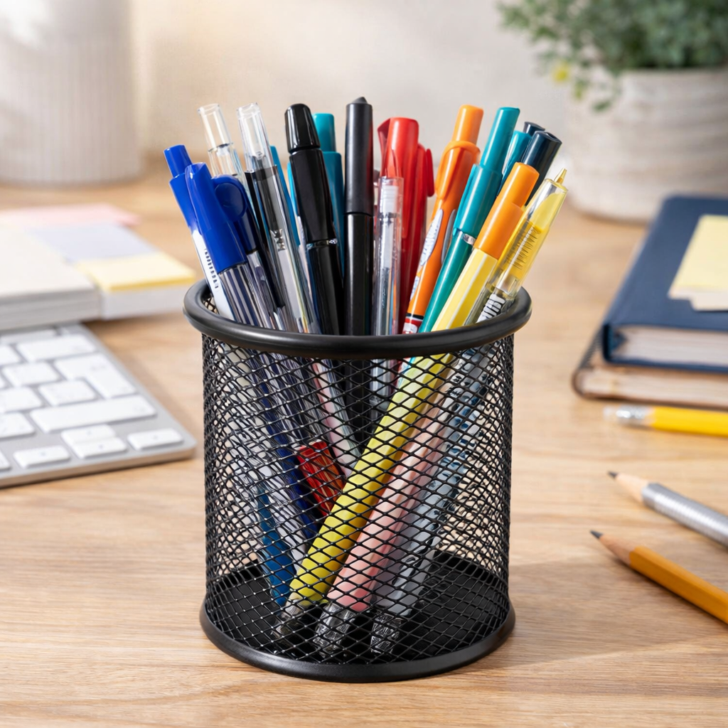 (Ø9x10cm) Porte-stylos en métal Organisateur de bureau Récipient pour instruments d'écriture - Noir