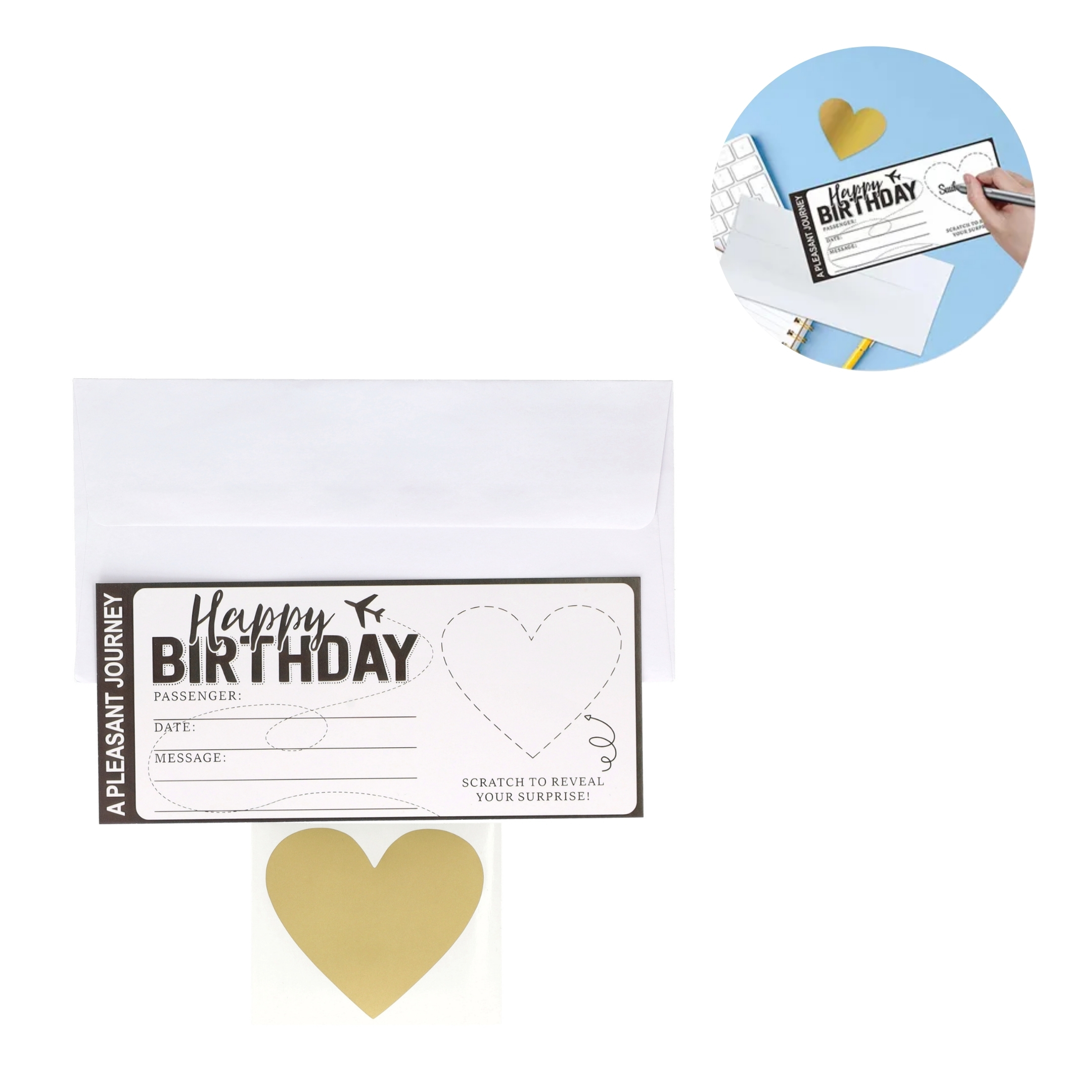 Ce Set de 10 cartes est une idée cadeau unique pour tous ceux qui souhaitent surprendre leurs proches avec une carte spéciale. Les cartes DIY Boarding Pass peuvent être inscrites individuellement et recouvertes d'un autocollant à gratter en forme de cœur. Ainsi, la destination du voyage reste un secret passionnant jusqu'au grattage. Ces tickets à gratter Surprise seront la garantie d'une expérience inoubliable !