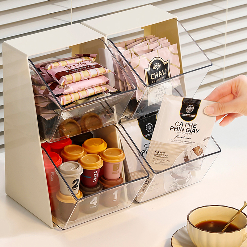Alors commande dès maintenant ces pratiques boites d'organisation en set de 2. Ce récipient est idéal pour créer de l'ordre dans la cuisine, en y rangeant par exemple des sachets de thé, des capsules de café ou des épices. Les 4 boîtes séparées sont transparentes et te permettent de voir d'un coup d'œil ce qu'elles contiennent. L'organisateur de cuisine est facilement lavable s'il est sale. Les produits cosmétiques et autres petites pièces peuvent également être rangés dans les boîtes.