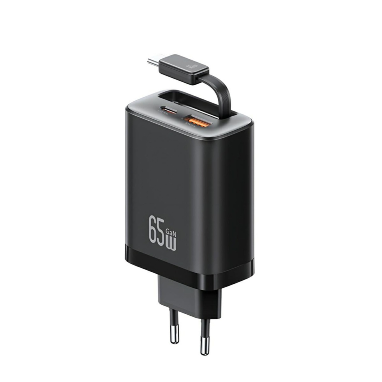 (65W) 3in1 2x USB C / 1x USB A GaN chargeur adaptateur secteur avec câble de charge rétractable + cordon d'alimentation (CC299TC01) - Noir