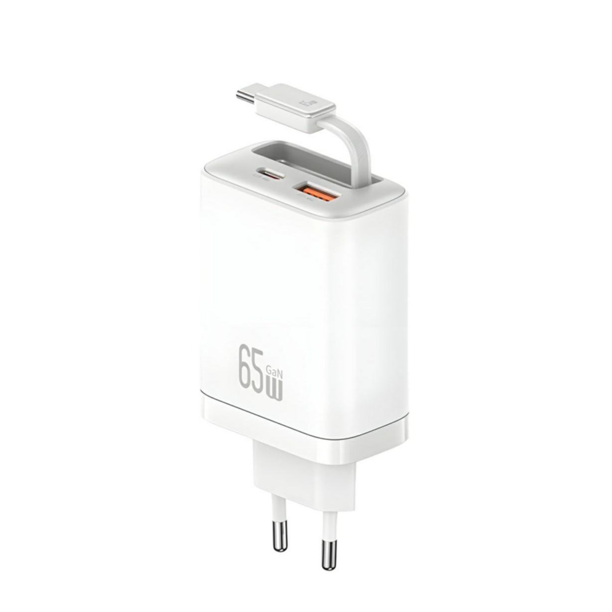 (65W) 3in1 2x USB C / 1x USB A GaN chargeur adaptateur secteur avec câble de charge rétractable + cordon d'alimentation (CC299TC02) - Blanc