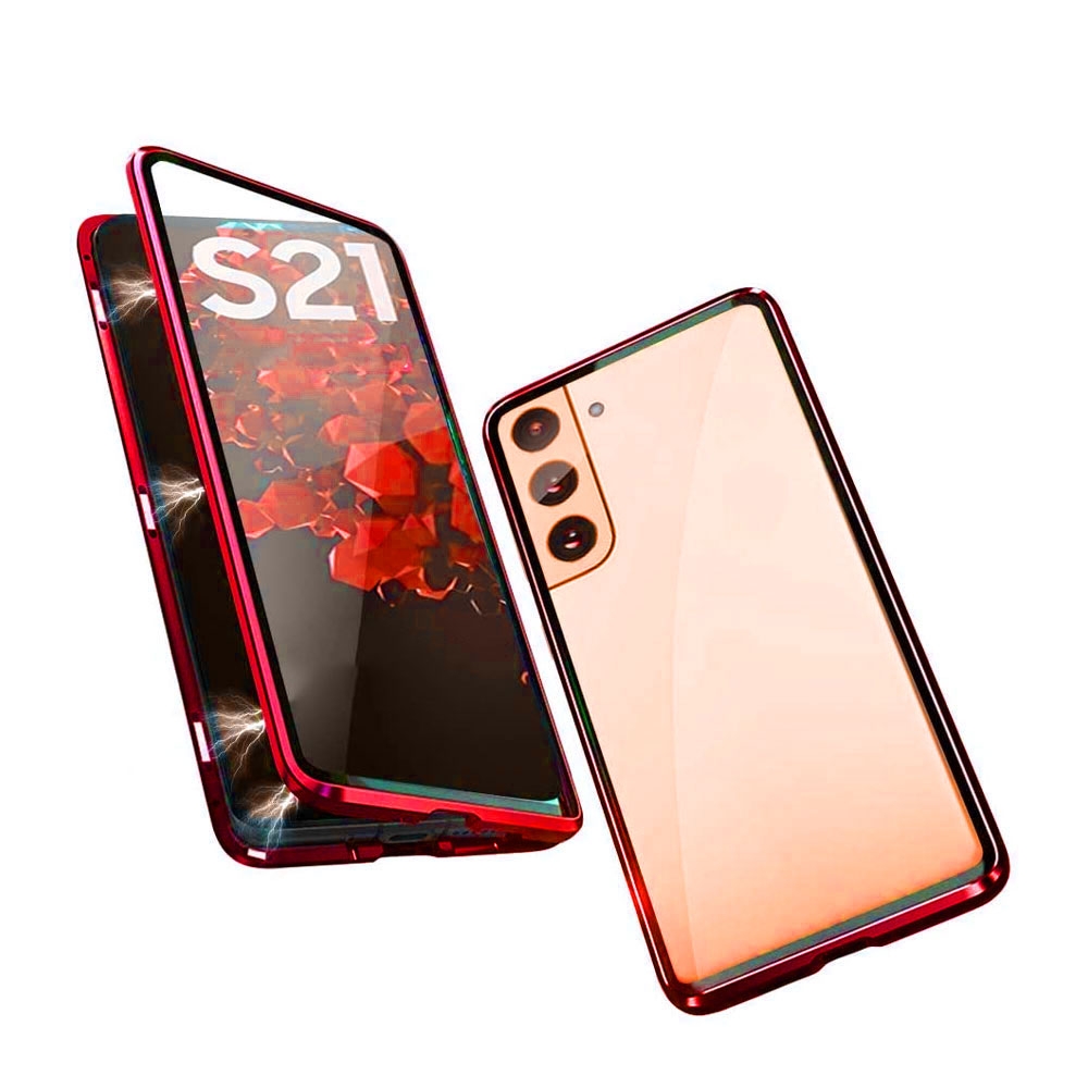 Samsung Galaxy S21 5G Magnetische Alu Schutzhülle mit Panzer Glas Backcover + Displayschutz (Magnet-Technologie) - Rot