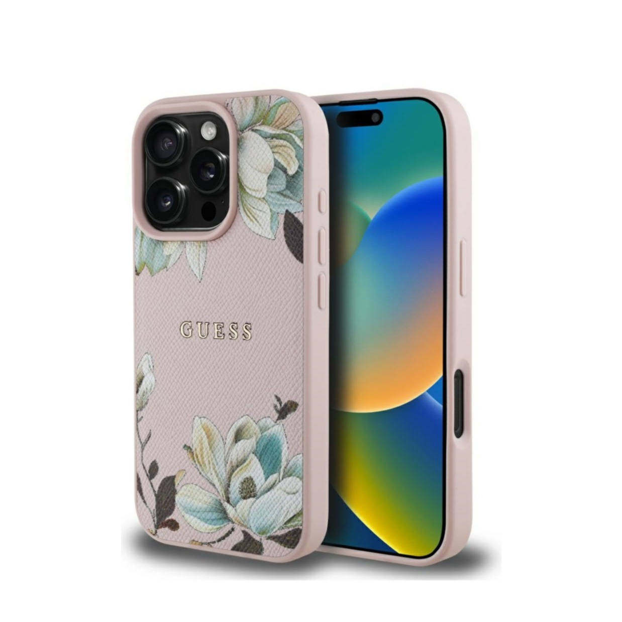 iPhone 16 Pro MagSafe Leder Hardcase Hülle Grained Printed Flower (GUHMP16LPGNMPLMP) - Rosa
