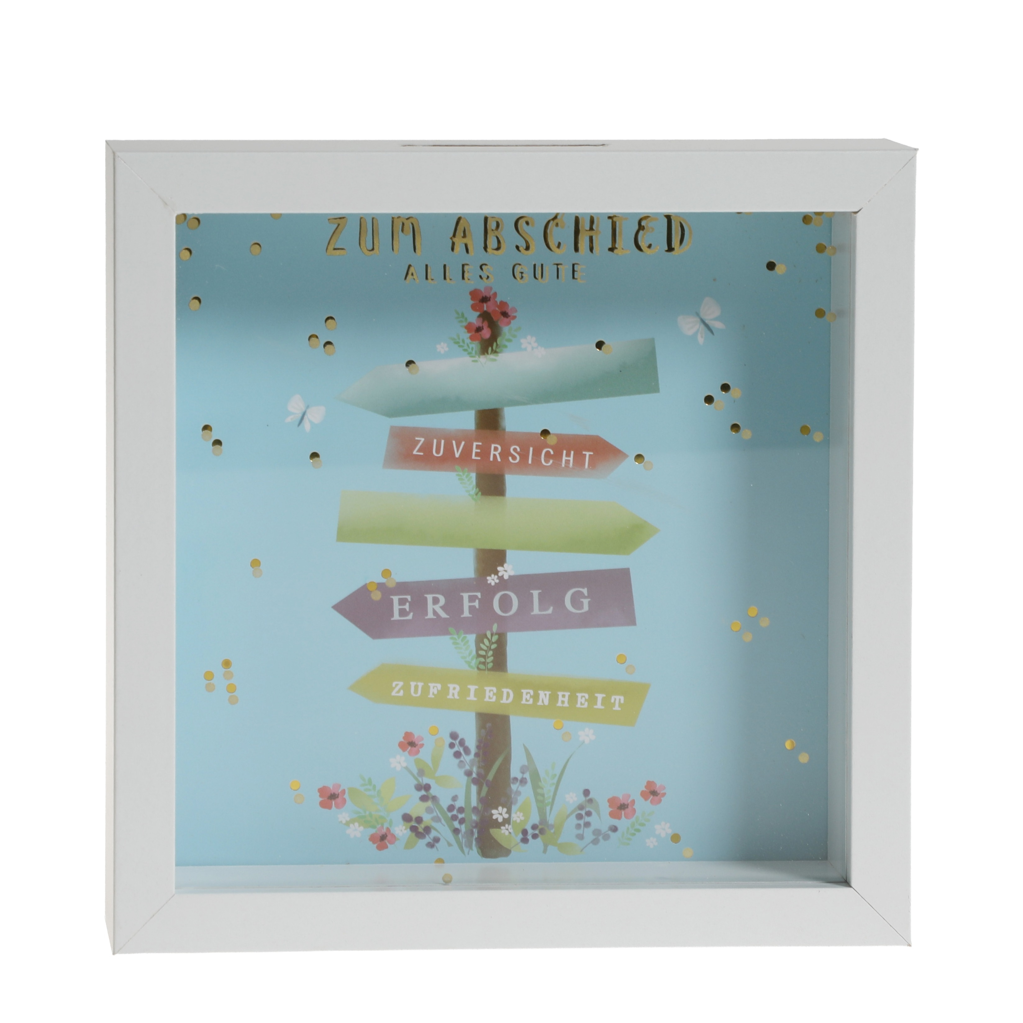 Diese tolle Spardose ist die ideale Lösung, um Geld Geschenke für Abschiede kreativ zu verpacken. Fülle die Spardose mit Bargeld und bereite der Beschenkten eine grosse Freude. Die Sparkasse besteht aus einem Holz Rahmen mit Glas Scheibe, welchen man sowohl aufhängen als auch aufstellen kann und somit eine tolle Home Dekoration ist!