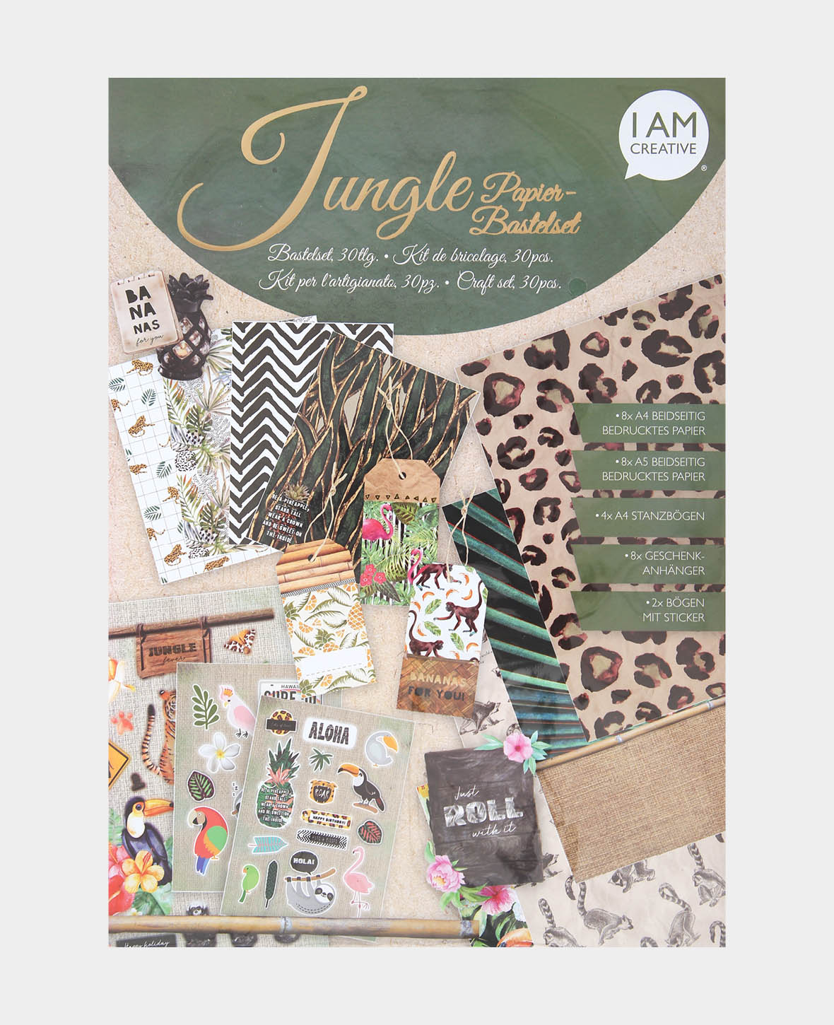 (30-tlg. Set) Papier Bastelset inkl. Designpapier / Aufkleber / Geschenkanhänger - Dschungel