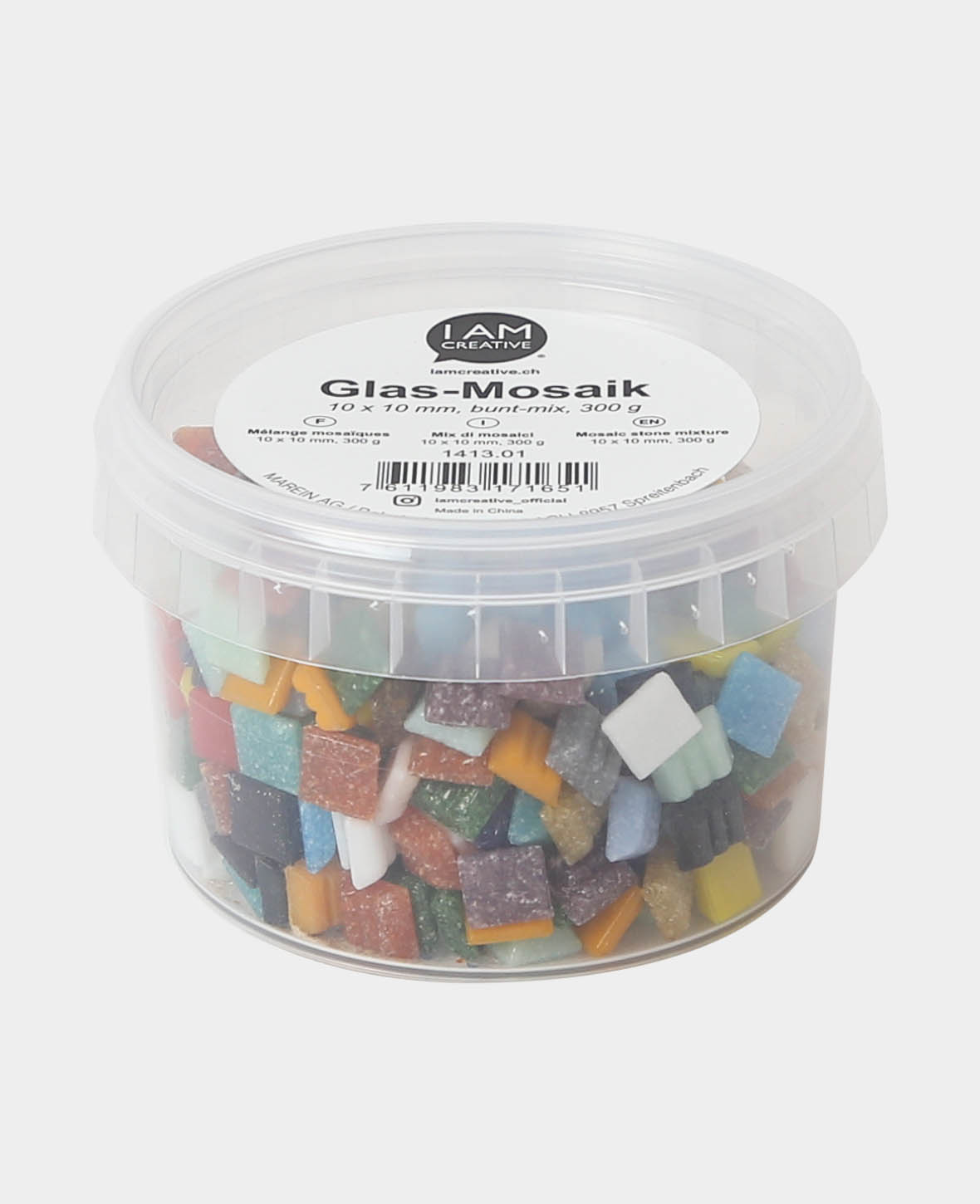 Mit dem I AM CREATIVE Glas-Mosaik Bunt Mix kannst du deiner Kreativität freien Lauf lassen! In den unterschiedlichsten Farben erhältlich, bietet das Mosaik endlose Gestaltungsmöglichkeiten - perfekt für Do-It-Yourself Projekte. Mit den 1x1 cm grossen Mosaik-Teilen kannst du im Nu einzigartige Kunstwerke erschaffen und deinen Raum mit individueller Dekoration verschönern.