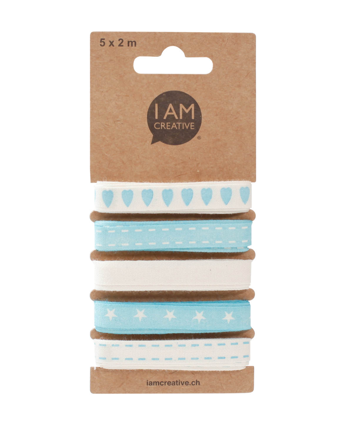 (5er Set) Geschenkband Baumwolle Deko Band mit Herz / Stern Print - Hellblau / Ecru