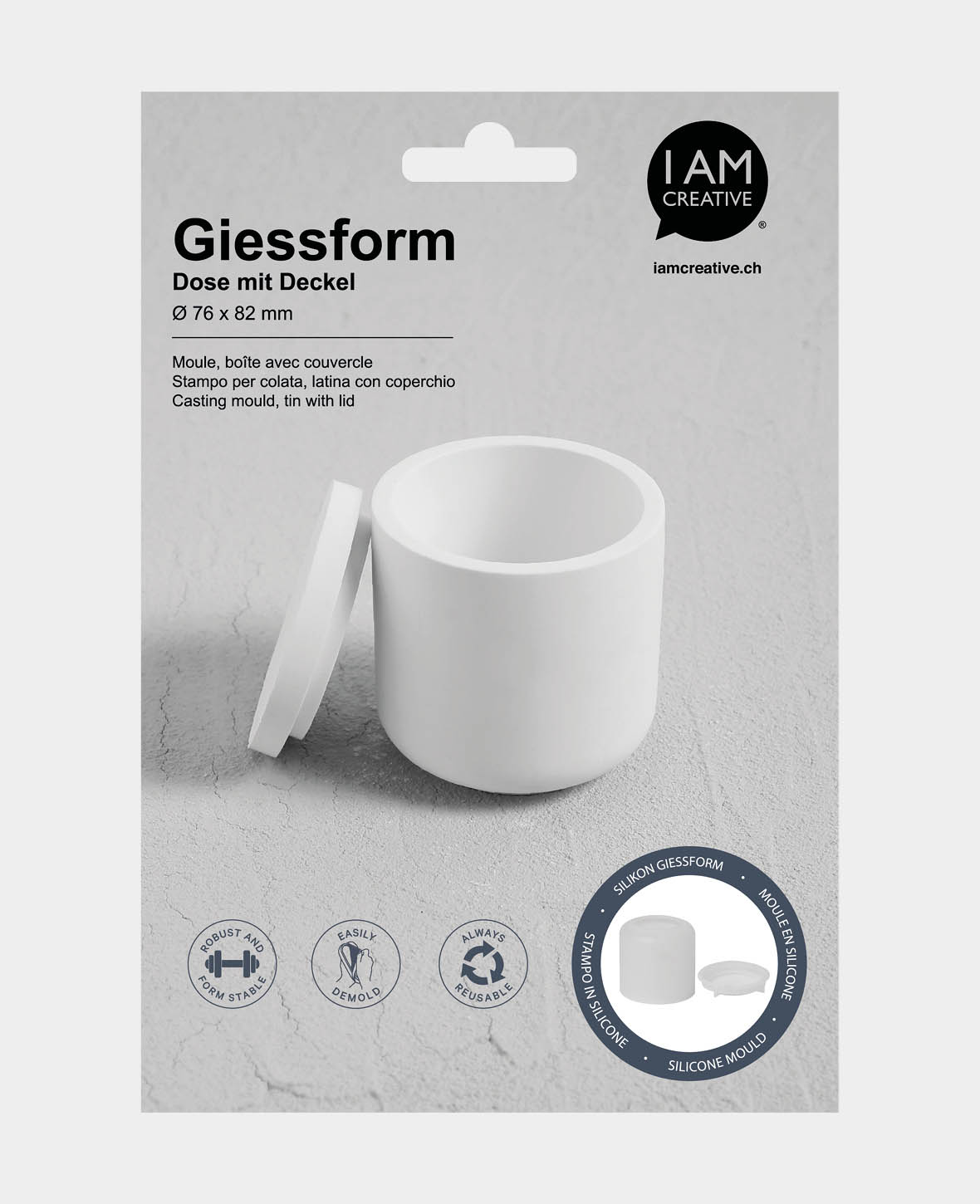 Verwandel deinen kreativen Geist in einzigartige, handgegossene Objekte mit der DIY Silikon-Giessform von I AM CREATIVE. Diese elastische und formstabile Gussform eignet sich hervorragend, um aus diversen Materialien wie Edelweiss-Giesspulver, Feinbeton, Giesseife, Giessharz, Wachs, Kreide oder Gips wunderschöne, individuelle Dosen und Deckel zu gestalten.