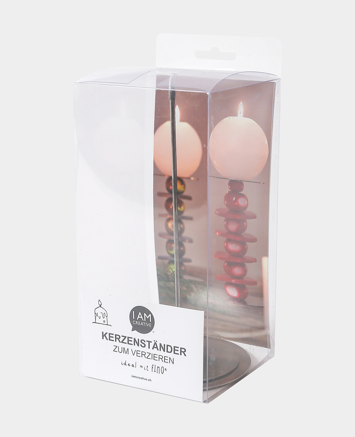 Kerzenlicht verleiht ein gemütliches Ambiente und eignet sich perfekt für eine gesellige Runde im Wohnzimmer. Noch schöner wird es, wenn die Kerze von einem selbstgestalteten Kerzenständer strahlt. Das Grundgerüst aus Metall, welches einen Sockel mit Spiess und eine aufsteckbare Scheibe als Tropfschutz umfasst, ist ideal, um es mit FIMO oder allerlei anderen Objekten zu verzieren. Zum Schutz des Untergrundes kann auf die Unterseite des Sockels eine im Set mitgelieferte Filzscheibe aufgeklebt werden.