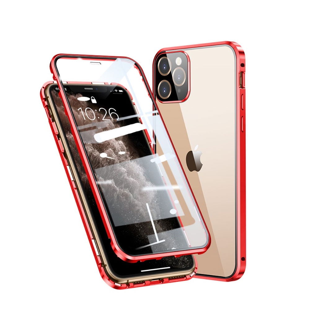 iPhone 11 Pro Max Magnetische Alu Schutzhülle mit Panzer Glas Backcover + Display- / Kameraglasschutz (Magnet-Technologie) - Rot