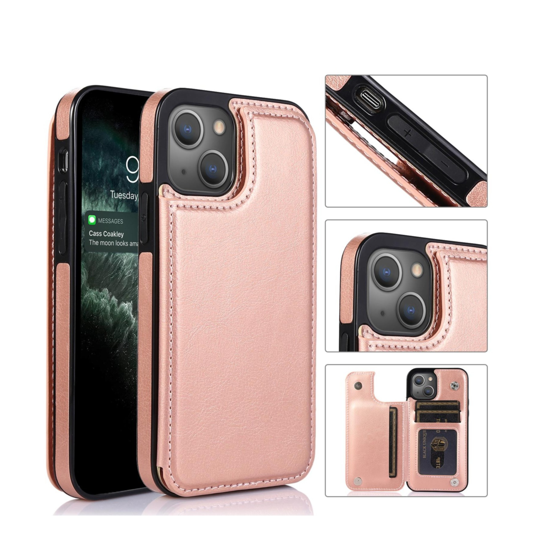iPhone 14 Hybrid Leder Hülle mit Kartenfach + Kickstand Aufsteller - Roségold