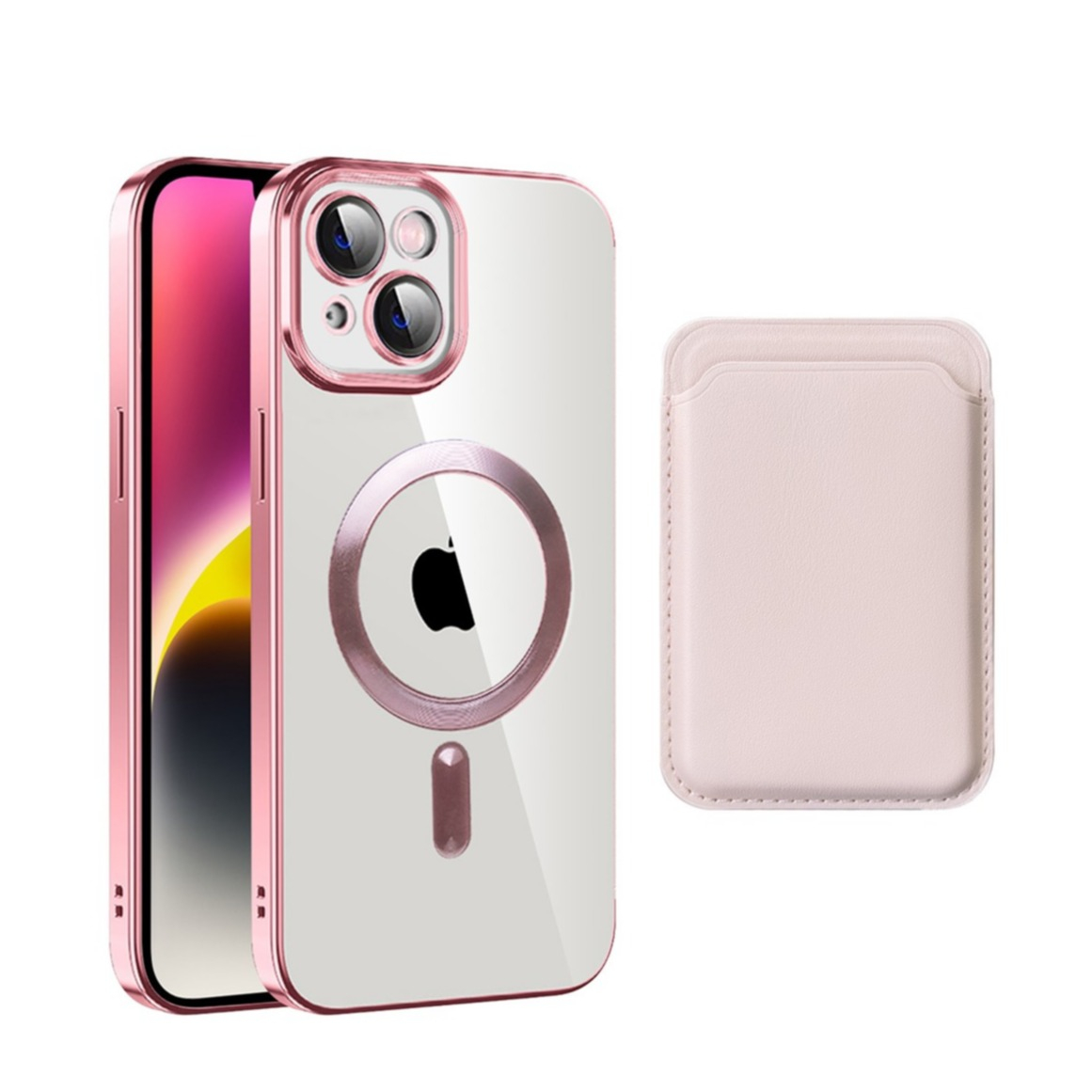 iPhone 14 2in1 MagSafe Hybrid Hülle TPU Bumper + Leder Wallet Kreditkarten Halterung - Rosa / Transparent