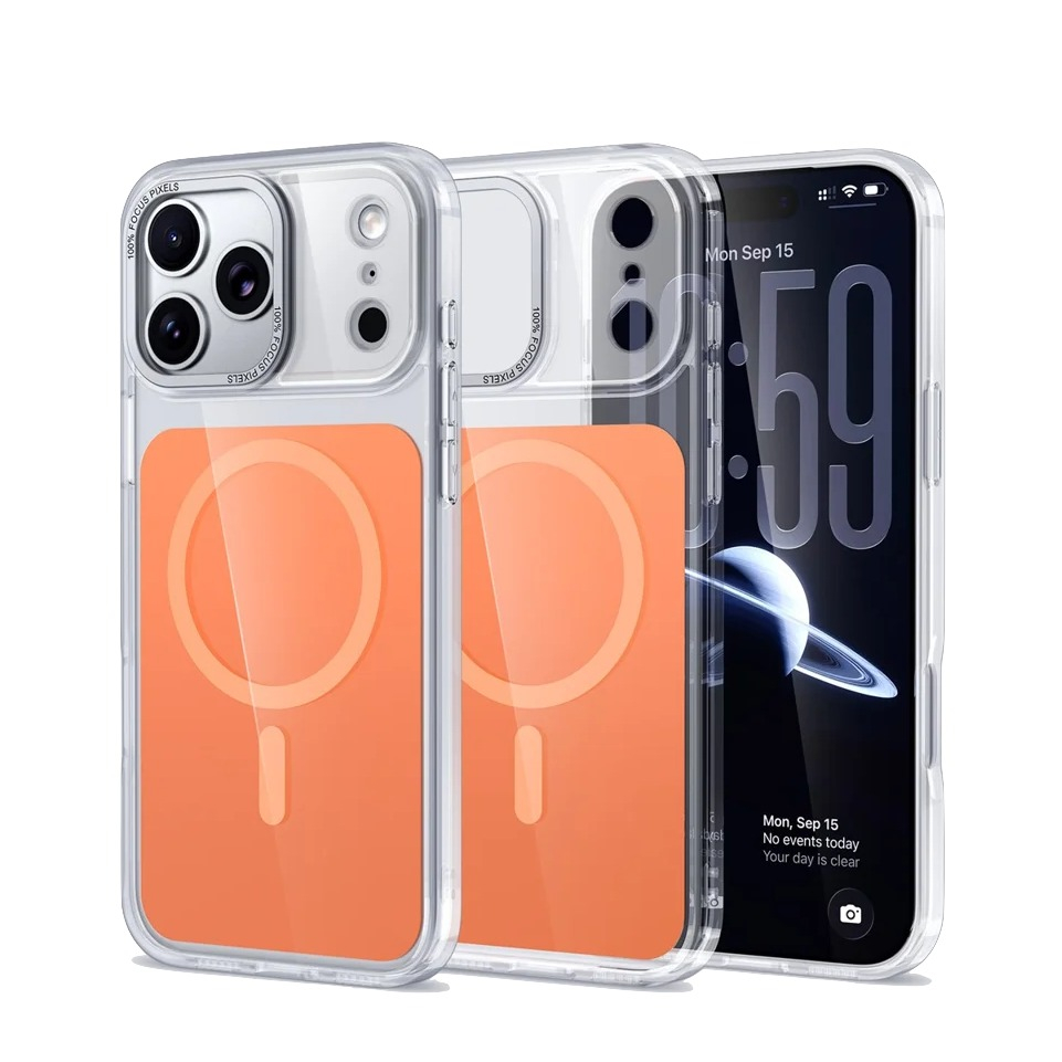 iPhone 17 Pro Max MagSafe Hybrid Hülle TPU Bumper Acryl Rückseite Air Cushion Fallschutz mit Kameraschutz - Transparent / Orange