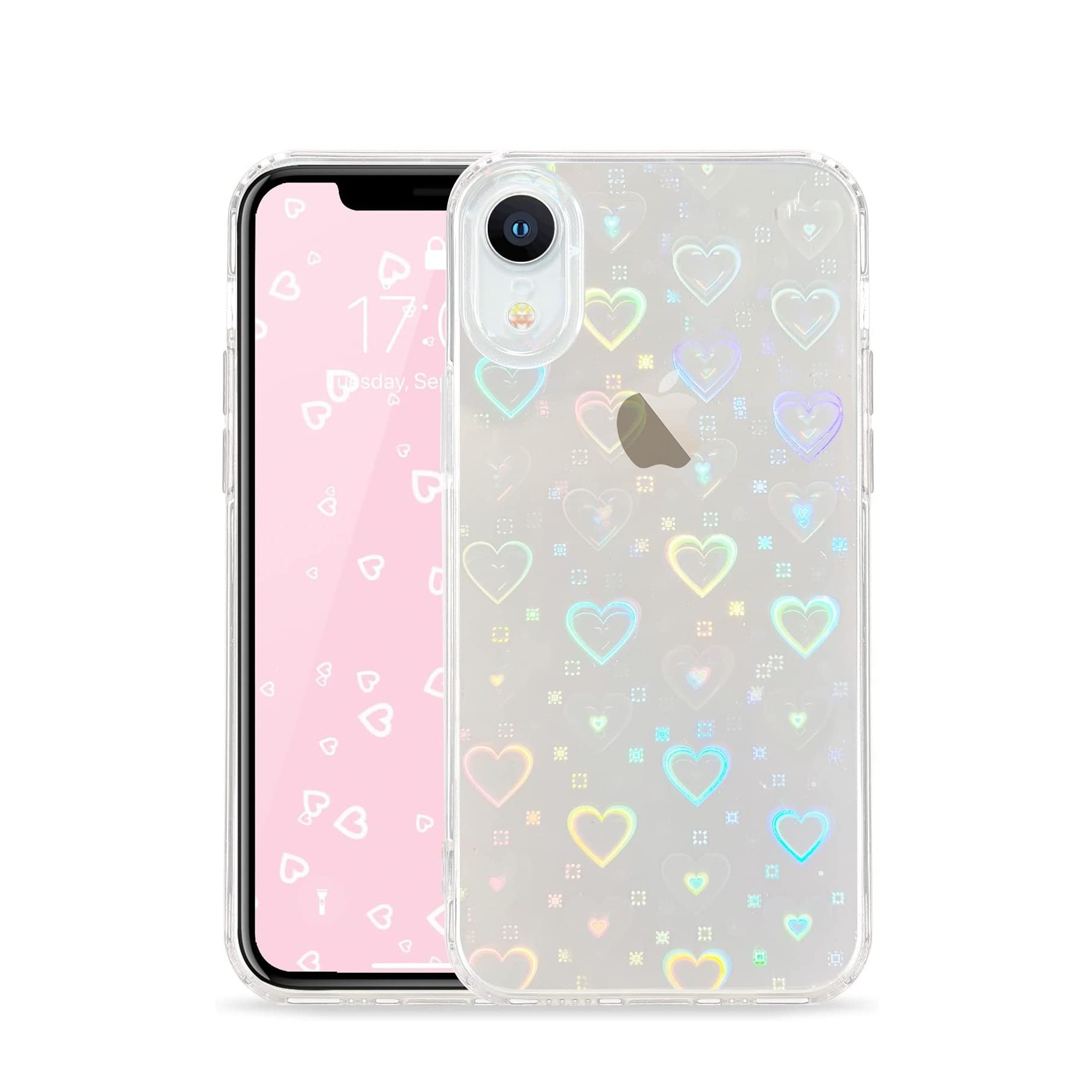 iPhone Xr Hybrid Hülle TPU Bumper + Laser Hologramm Glitzer Herze - Transparent