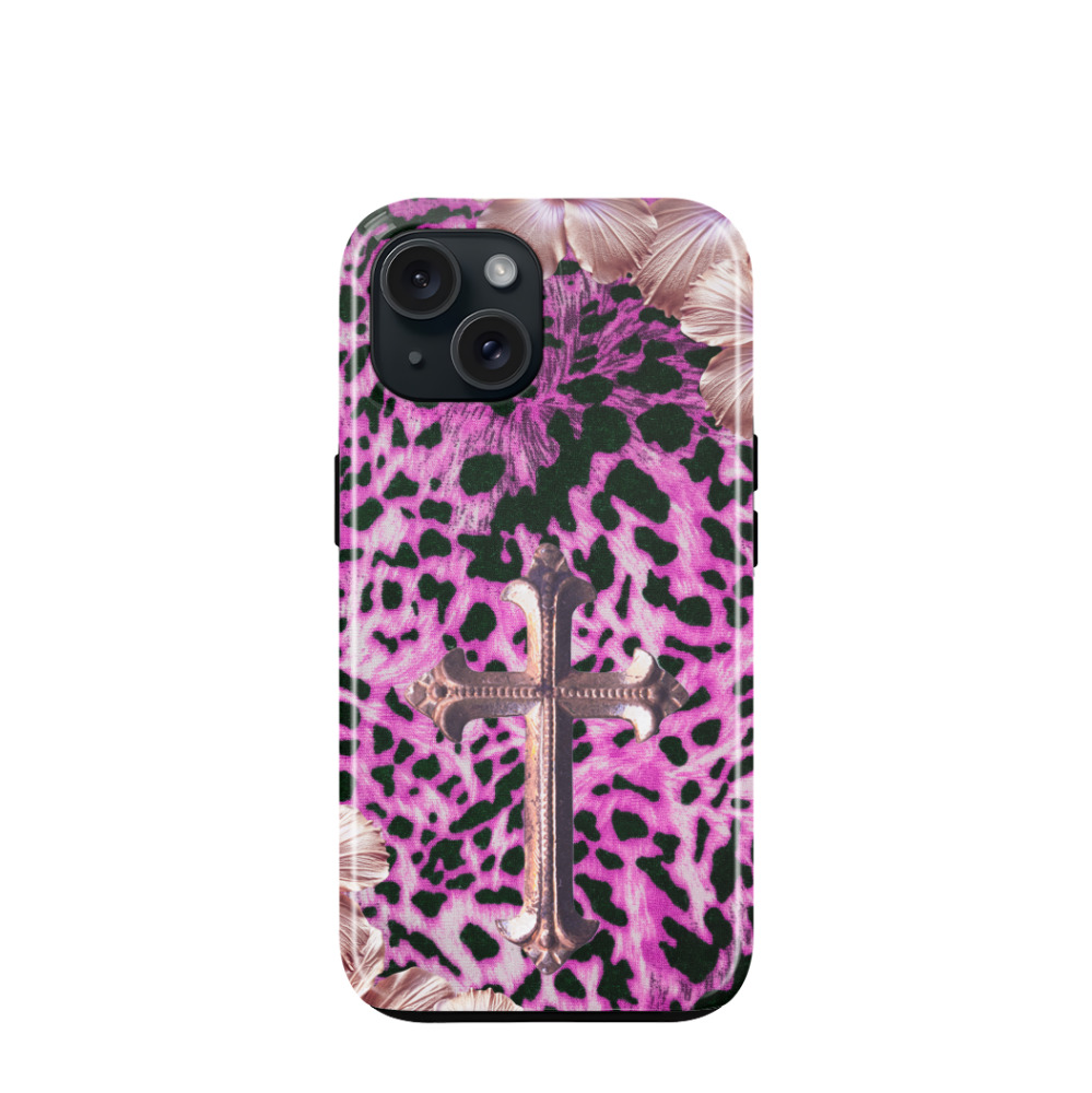 iPhone 15 Hybrid (Kunststoff / Gummi) Hülle Neon Leopard Rosee Cross - Pink