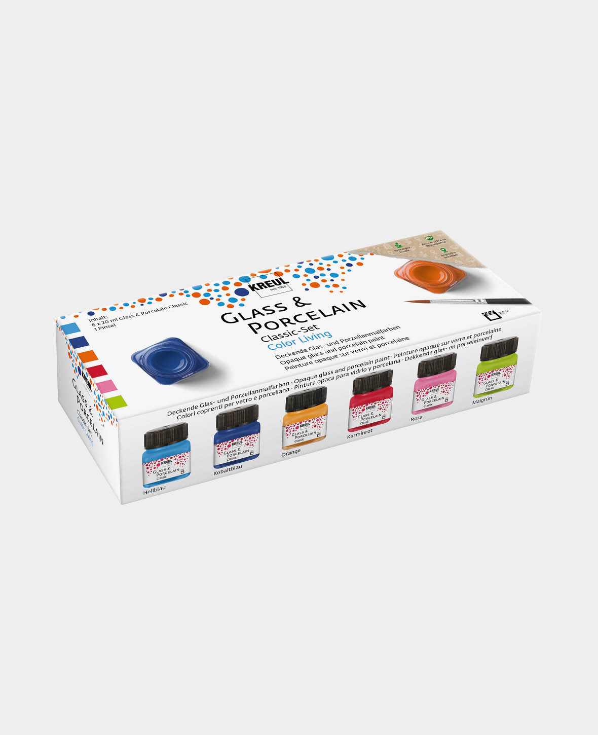 Mit unserem KREUL Glass & Porcelain Classic Set Color Living bringst du Frische und gute Laune auf deinen Tisch! Lade dich mit sechs fröhlichen Farbtönen ein, um Glas und Keramik zu gestalten. Ob ein paar schicke Tupfer auf Tassen oder grossflächiges Color-Blocking auf Gläsern – die deckenden Glas- und Porzellanmalfarben sorgen für ein Lächeln im Gesicht.