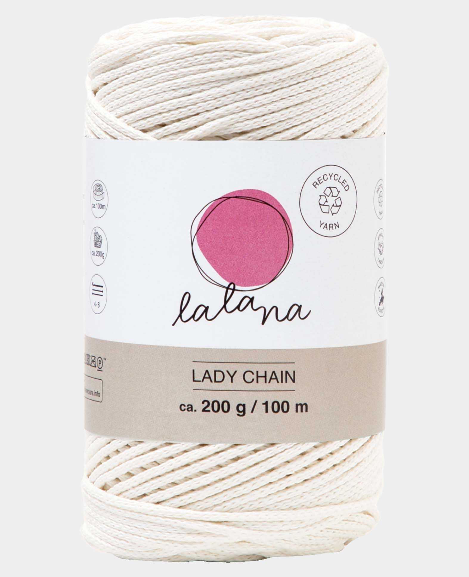 Lalana ist stolz darauf, ein nachhaltiges Produkt anzubieten - dieses Garn besteht zu 100% aus recycelten Stoffresten aus der Textilindustrie. Mit diesem vielseitigen Kettengarn kannst du deinen kreativen Ideen freien Lauf lassen, ganz gleich, ob du am Häkeln von Taschen, Stricken von Pullovern oder Knoten dieser wunderschönen Dekorationen ohne Fransen interessiert bist.