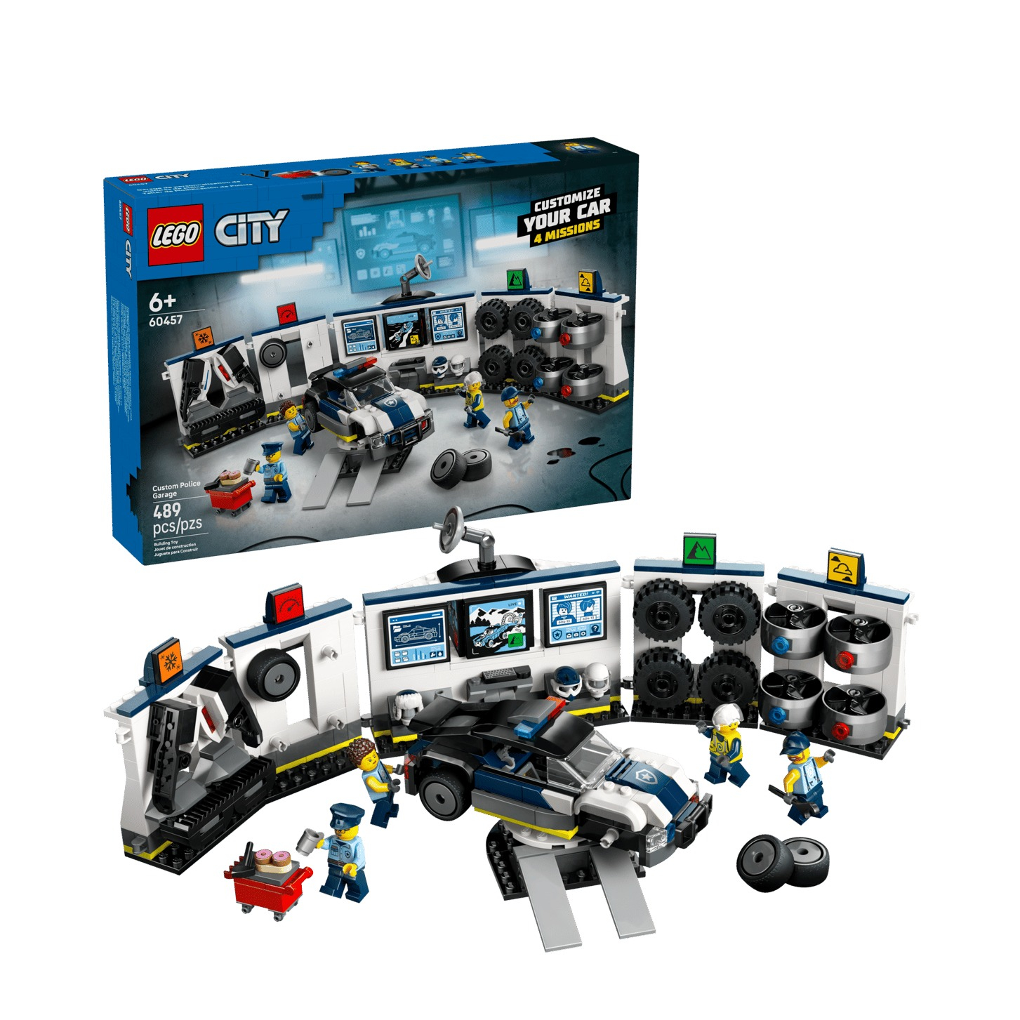Das Spielset bietet einen Streifenwagen und eine vielseitige Werkstatt. Dort können Kinder das Fahrzeug für Einsätze auf Strasse, Gelände, Schnee oder in der Luft ausrüsten. Zur Ausstattung gehören Drehscheibe, Bildschirme, Werkzeugwagen und verschiedene Anbauteile. Die Werkstatt lässt sich durch flexible Module individuell gestalten.