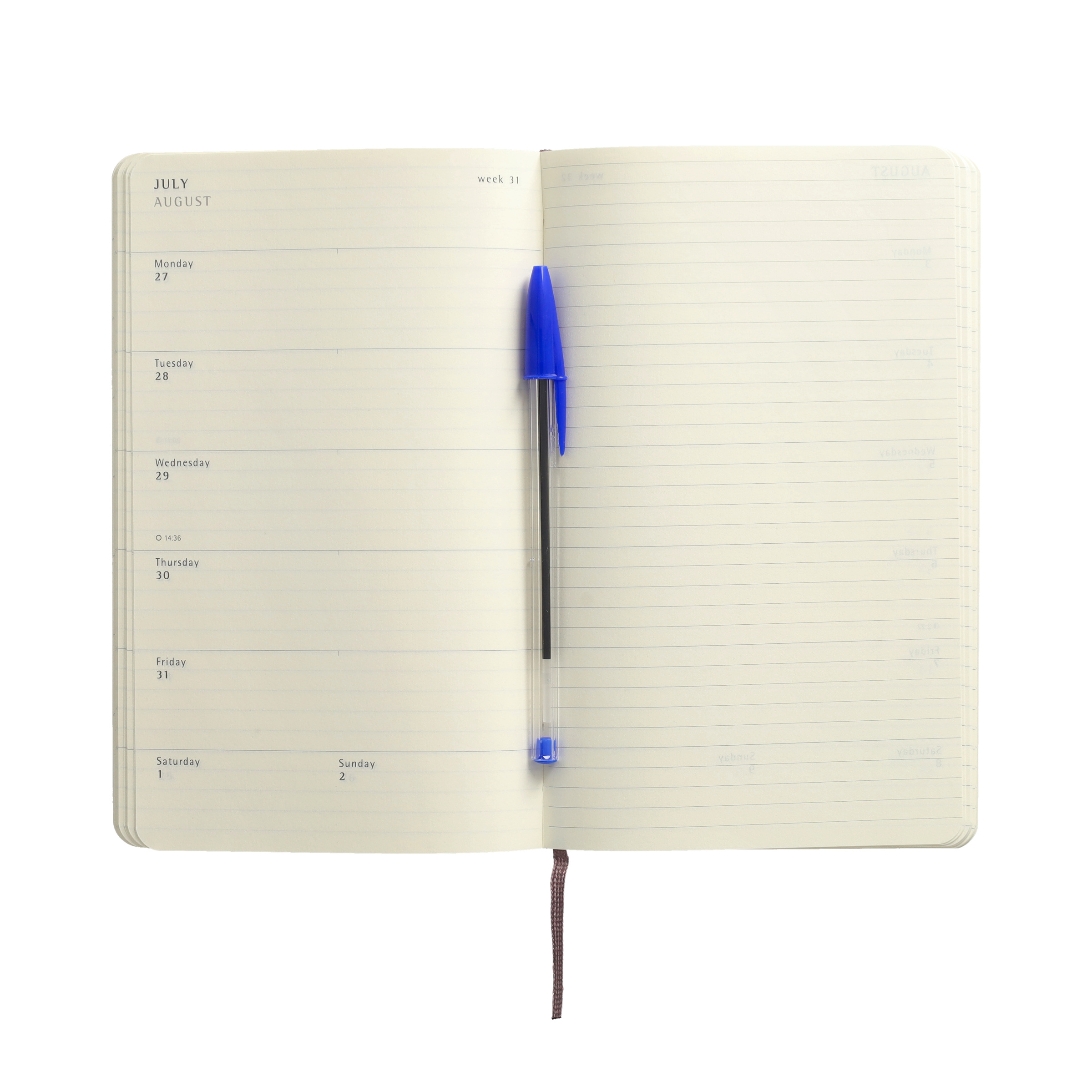 Dann ist diese schlichte Soft Cover Geschäftsagenda von Moleskine perfekt dafür geeignet. Der Weekly Kalender, mit einer horizontalen Übersicht auf der rechten Seite und eine quer linierte linke Seite, bietet dir nicht nur genug Platz für Termine, Geburtstage, Notizen etc., sondern kann auch mit den mitgelieferten Stickern beklebt werden für zum Beispiel wichtige Infos. Die Faltentasche und das Gummiband vermeiden unerwünschtes Herausfallen von losen Notizen, Fotos etc. und das Lesezeichen verhilft dir, die richtige Woche zu finden.